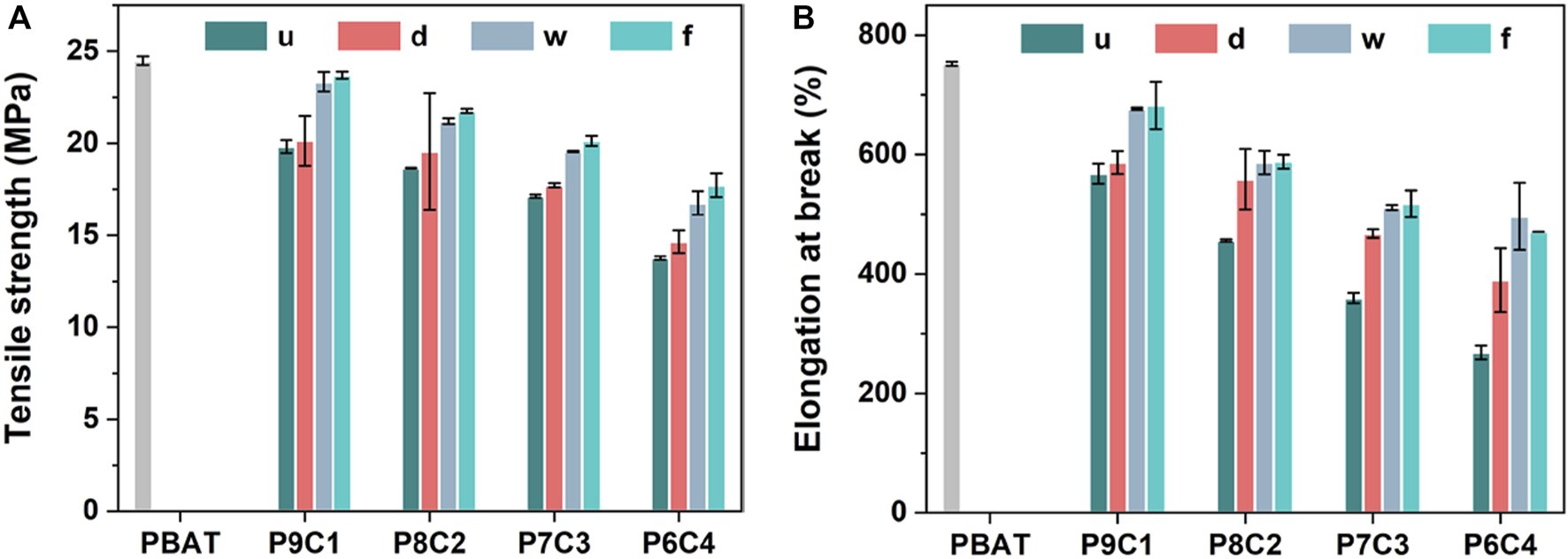 Tensile strength and elongation at break were used to evaluate the mechanical properties of the composites for determining the effect of filler modification methods and content on them. Figure 5 depicts the results. Overall, the order of tensile strength and elongation at break is PBAT > P9C1 > P8C2 > P7C3 > P6C4 because in the blended system, as the filler amount increases, the mechanical properties decrease due to the poor compatibility between CaCO3 and PBAT. Furthermore, the high CaCO3 content will result in non-uniform dispersion and obvious agglomeration, resulting in decreased mechanical properties. The overall experimental result for the chosen CaCO3 filling amount is 30 wt.%, which not only maintains the performance of the composite material but also reduces its cost.