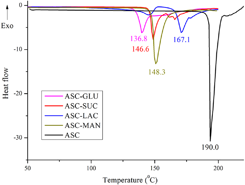 DSC heating curves of ASC-sugar (1:1) eutectics confirmed single phase entity.
