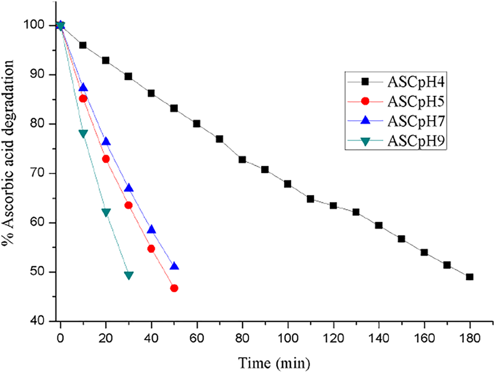 ASC degradation with increasing pH (4→9) that reflects its shorter half-life (UV measurements are recorded at 5 min interval).