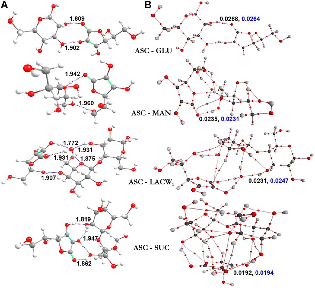 Ascorbic acid with sugars of (A) the most stable optimized geometries (along with distances Å) and (B) electron [ρ(rc)] and Laplacian [∇2ρ(rc)] density values are displayed in black and blue colors, respectively.