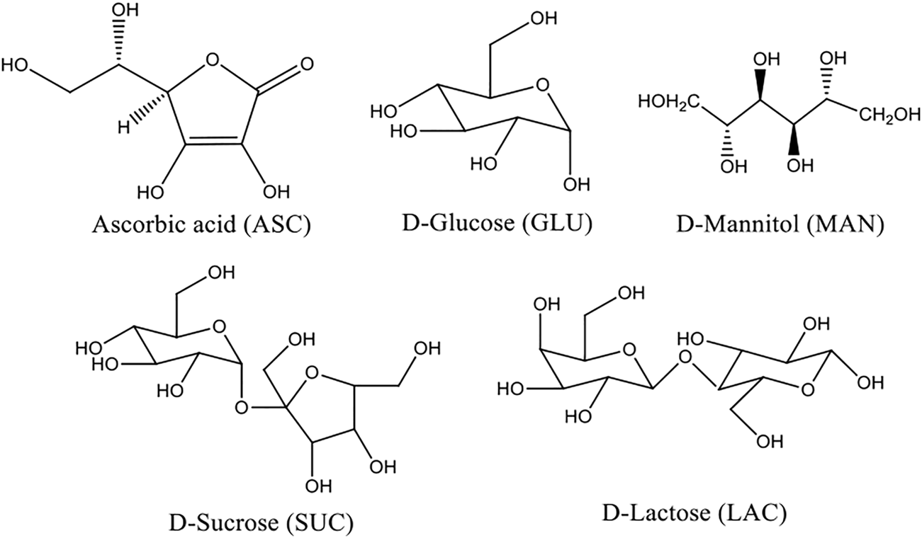 The ASC binary eutectics with sugars were prepared according to the common procedure. ASC (1 mmol) and sugar (1 mmol) were subjected to grinding using a mortar and pestle. The grinding was continued for 15 min by adding a few drops of methanol at regular intervals of time. The ground mixture was dried under vacuum at ambient conditions. Note, the ASC cocrystals with nicotinic acid, nicotinamide, l-serine, and sarcosine were prepared according to the literature procedure (Kavuru et al., 2010; Wang et al., 2016).