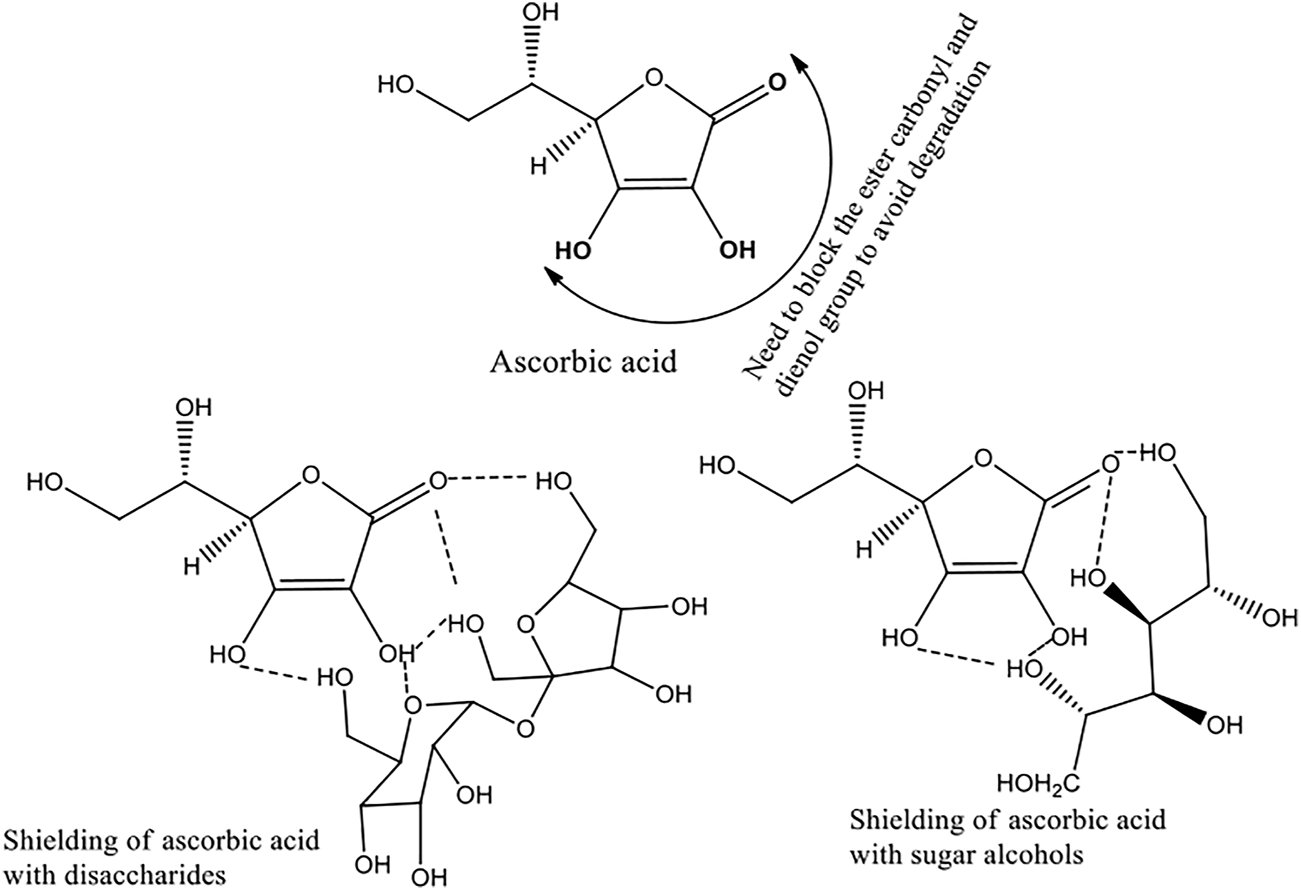 Proposed non-bonded interactions in ASC eutectics with sugars and sugar alcohols to inhibit oxidative degradation.