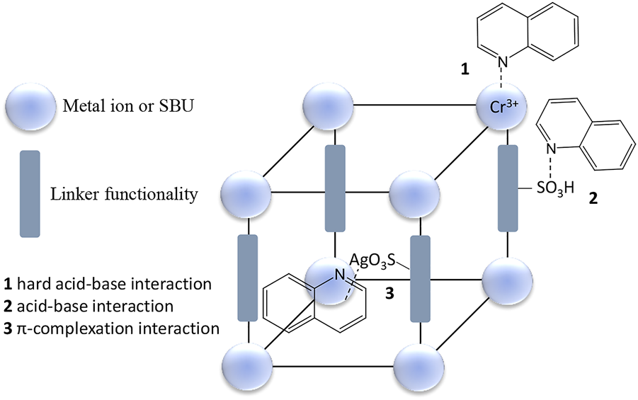 Following these revelations on what matters regarding adsorption of nitrogen-containing compounds using MOFs researchers went on a drive to improve the adsorption performance of other MOFs through modifications which include incorporation of functional groups (e.g. –SO3H, amino group) (Hasan et al., 2014; Ahmed et al., 2015; Ahmed and Jhung, 2015b) and Lewis acid sites (e.g. CuCl, phosphotungstic acid and AlCl3) (Ahmed et al., 2013a; Ahmed et al., 2014; Ahmed and Jhung, 2014) (Table 3). Composites between MOFs, and MOFs with other materials such as graphene oxide have also been tested (Table 3) (Ahmed et al., 2013b; Ahmed and Jhung, 2016b; Bhadra and Jhung, 2020). Lewis acid sites are also used to add functional moieties inside the pores of the MOFs (Van de Voorde et al., 2013b). She et al. (She et al., 2018) reported a highly selective metal organic framework with immobilized Ag(I) sites, (Cr)-MIL-101-SO3Ag, which nitrogen-containing compounds to interact with adsorption sites through multiple ways simultaneously (Figure 5).