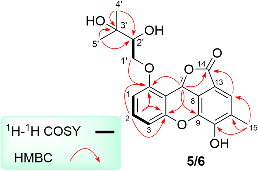 Cytorhizophin H (5): pale yellow powder [α]25D = ‒117.5 (c 0.06, MeOH); CD (MeOH, 0.2 mg/ml): 202 (+42.2), 214 (−33.5), 235 (−4.2), 243 (−8.7) nm; UV (MeOH) λmax (log ε) 311 (4.01), 282 (3.90) nm; IR νmax 3,303, 2,828, 1715, 1,462, 1,423, 1,281, 1,236, 1,192, 1,144, 1,045, 1,011, 902, 786 cm−1. For 1H and 13C NMR, see Table 3; HRESIMS: m/z 373.1285 [M + H]+ (calcd for C20H21O7, 373.1282).