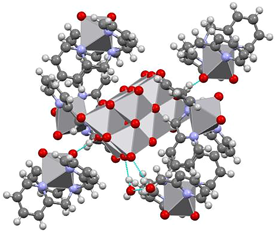 Mercury representation of a chain of decavanadate anions connected through water molecule forming rings R33 (8) and R44 (12).
