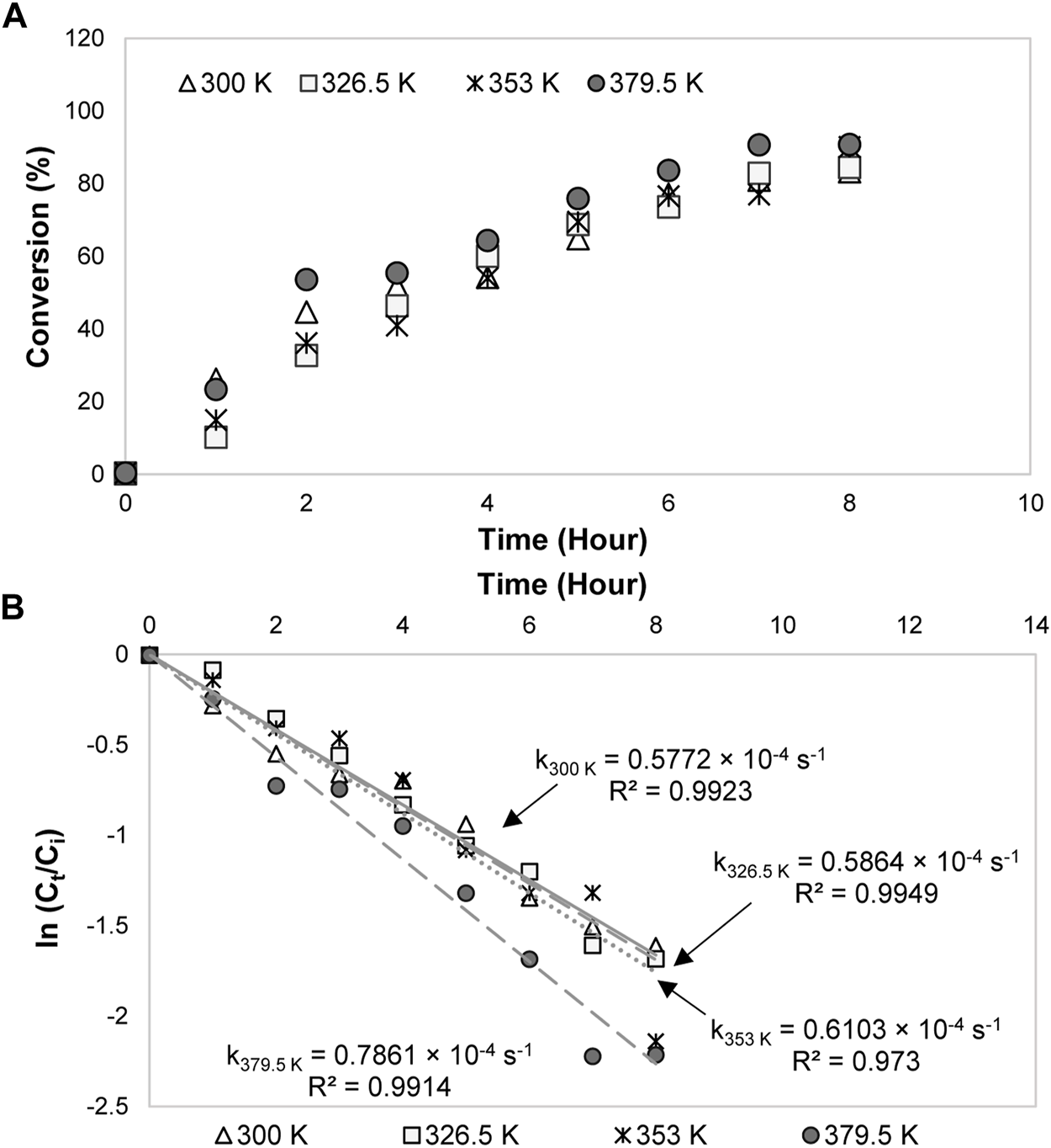 FIGURE 5. (A) Glycerol conversion and (B) first-order kinetics model for 0.3 mol/L of glycerol electrocatalytic reduction at different reaction temperatures.