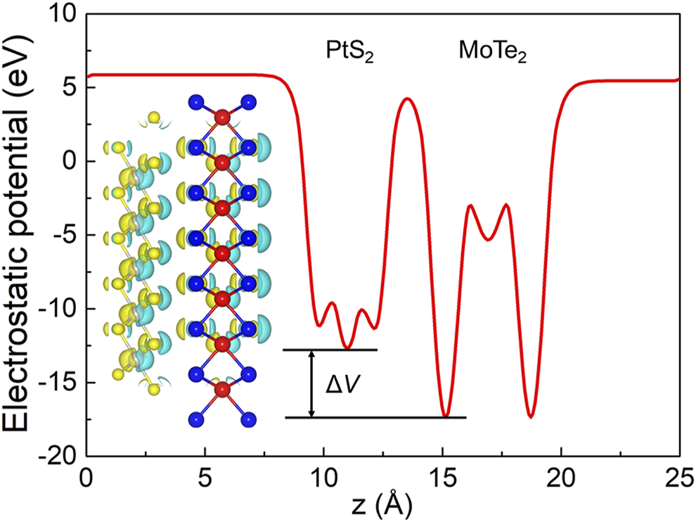The potential drop between the interface of the PtS2/MoTe2 vdW heterostructure; the inset represents the charge density. The isosurface lever was set at 0.015|e|.