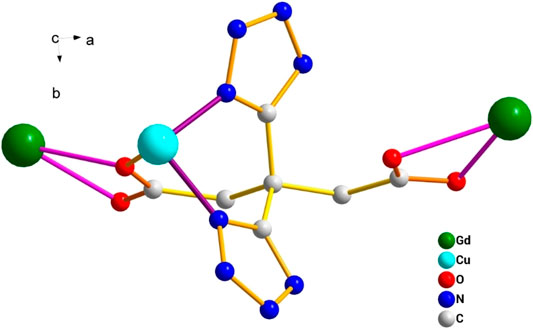 This complex belongs to the monoclinic space group P21/n with a crystallographic ally-independent symmetric unit. From Figure 2, each Gd(III) atom is nine-coordinated by four oxygen atoms (O1, O2, O3A, and O4A) from two carboxylate groups and five oxygen atoms (O5, O6, O7, O8, and O9) from five water molecules, thus forming a deformed and distorted tricapped trigonal prism coordination configuration. The Cu(II) cation is coordinated with four nitrogen atoms (N1, N5, N1B, and N5B) of the tetrazole ring and two carboxyl oxygen atoms (O1 and O1B) from two L4− ions, forming a deformed octahedron coordination configuration. In addition, four oxygen atoms from two carboxyl groups of L4− chelated with two Gd(III) ions (Figure 3), and two N atoms from two tetrazole rings and a carboxyl oxygen atom connected with one Cu(II) ion (Scheme 1). By analyzing the bond lengths of the complex, the bond lengths of Gd–O are 2.391–2.544 Å and that of Cu–O are 2.492 Å. The bond lengths between the Cu atom and N atom are in the range of 1.976–1.992 Å. As shown in Figure 4, two such ligands set up a double bridge between two Cu(II) ions and two Gd(III) ions to generate a bimetallacycle of [Cu2Gd2(L)2]. The adjacent bimetallacycle is further connected to yield a one-dimensional chain structure, and by hydrogen bonding between the chains, a three-dimensional supramolecular structure was formed (Figure 5).