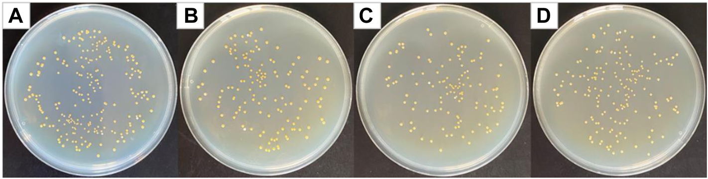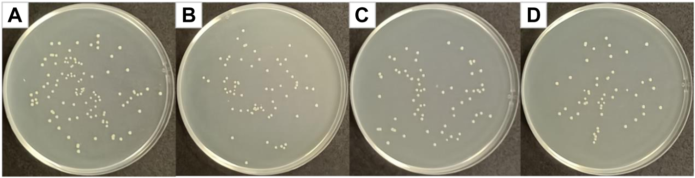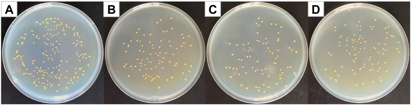 Photographs of antibacterial test result against Staphylococcus aureus(A) blank group, (B) CF2, (C) CF1, and (D) CF3.