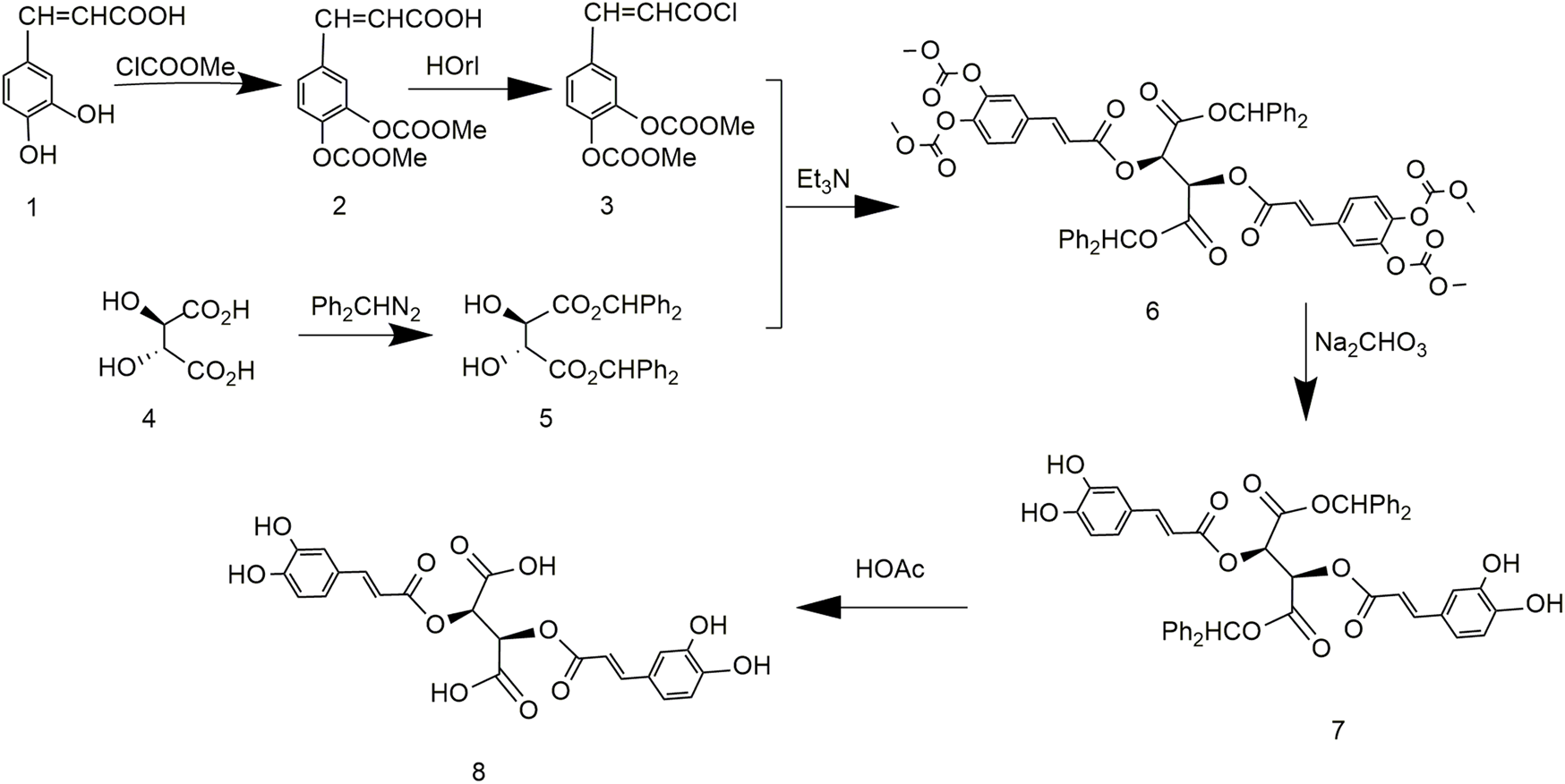 Tian S. X. Li H. L. Xu G. Y. Chen B. (2021). A Synthetic Method of Cichoric Acid and Preparation of L-Cichoric Acid Crystal Form. China. Patent No CN109678706B. Beijing: China: State Intellectual Property Office Patent Office.