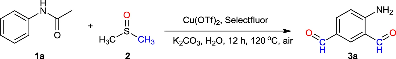 We commenced the study by choosing acetanilide (1a) as the model substrate and optimized the reaction conditions through catalyst, oxidants/radical initiators, and temperature (Table 1). Based on the yields obtained, it was found that the reaction of acetanilide (1a, 0.2 mmol), Selectfluor (0.5 mmol), copper (II) trifluoromethanesulfonate (0.04 mmol), water (50 μL), and potassium carbonate (0.4 mmol) in dimethyl sulfoxide (1 mL) at 120°C for 12 h provided the best result, yielding the product 4-aminobenzene-1,3-dicarbaldehyde (3a) in 78% based on 1a (entry 1). The use of other copper (II) salts such as Cu(NO3)2·6H2O, CuSO4·5H2O, and CuCl2·H2O as the catalysts would lead to the generation of 3a in lower yields 13%–45% (entries 2–4). It seems that the process of reaction was related to Cu2+ ions rather than anions. The decrease of yields was probably due to the strength of the coordination bonds between Cu2+ and their anions. This result was consistent with the finding that the use of other metal salts such as Ni(OTf)2, Zn(OTf)2, and CoSO4·H2O as the catalysts did not provide the corresponding product at all (entries 5–7). Selectfluor worked as a highly efficient radical initiator in this reaction. When Selectfluor was replaced with K2S2O8 or TBHP under the same conditions, no product could be obtained (entries 8 and 9). A temperature range of 120°C–140°C was found necessary for the formation of 3a. Lower temperature would decrease the yield dramatically down to trace (100°C), and higher temperature did not bring about additional yield (76%, 140°C).