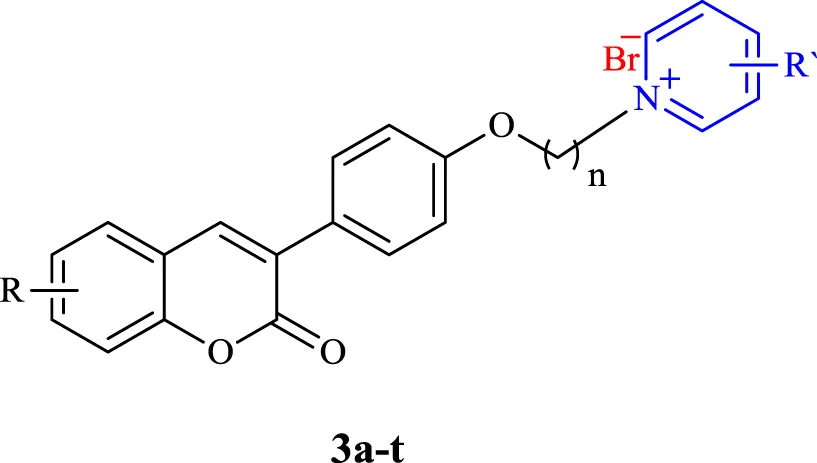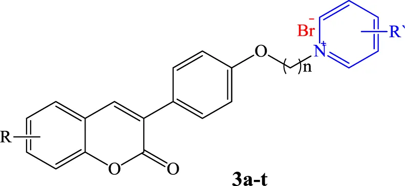 All products were synthesized using commercially available 4-Hydroxyphenylacetic acid. Compound 1 was initially synthesized via the reaction of 4-hydroxyphenylacetic acid with different salicylaldehyde derivatives in the presence of sodium acetate (NaOAc) in acetic anhydride (Ac2O) under reflux conditions. The intermediate 1 was then reacted with an excess amount of various alkyl dibromides, potassium carbonate (K2CO3) in dry acetone under reflux condition, followed by reaction with different substituted pyridine in neat condition at 80°C to obtain the desired target compounds 3a-q (Scheme 1). Also, products 3r-t were directly synthesized from the reaction of compound 2 with 4-dimethylaminopyridine in dry acetonitrile under reflux conditions. All the reactions were monitored by TLC, and the products were purified simply by adding ether to the reaction solution. IR, 1H and 13C NMR spectroscopy were utilized for the product characterization.