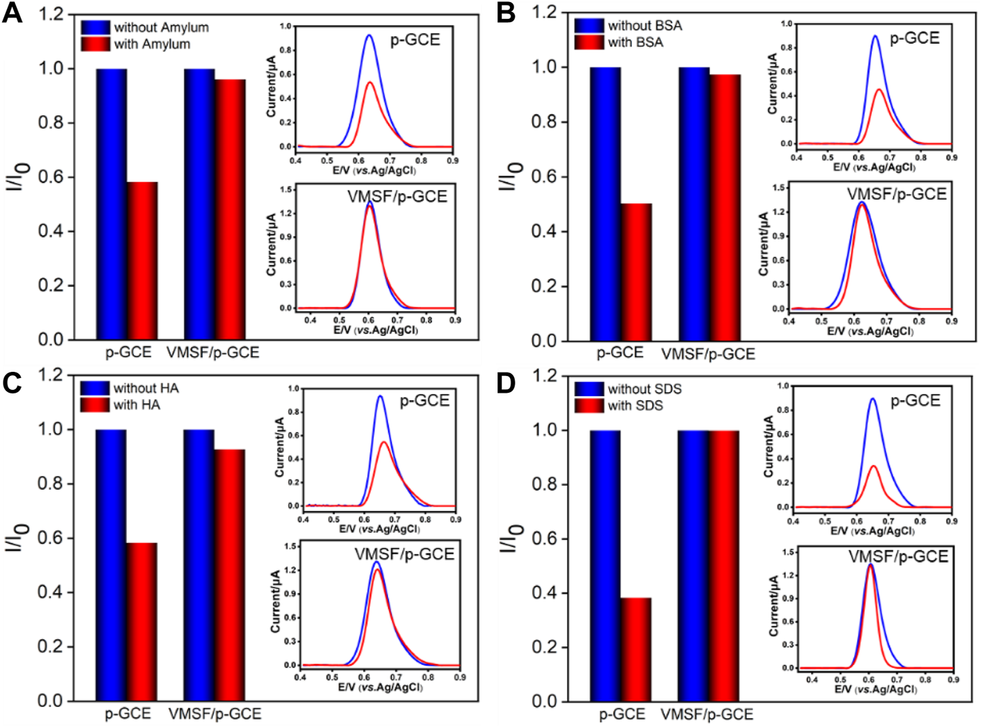 Normalized oxidation peak current ratio on p-GCE and VMSF/p-GCE toward BPA (1.0 μM). I and I0 represent the currents obtained in the presence and absence of 50 μg/ml of amylum (A), BSA (B), HA (C), or SDS (D) in PBS (0.1 M, pH = 6). The insets are the corresponding DPV curves obtained on p-GCE and VMSF/p-GCE in the absence and presence of the fouling species.