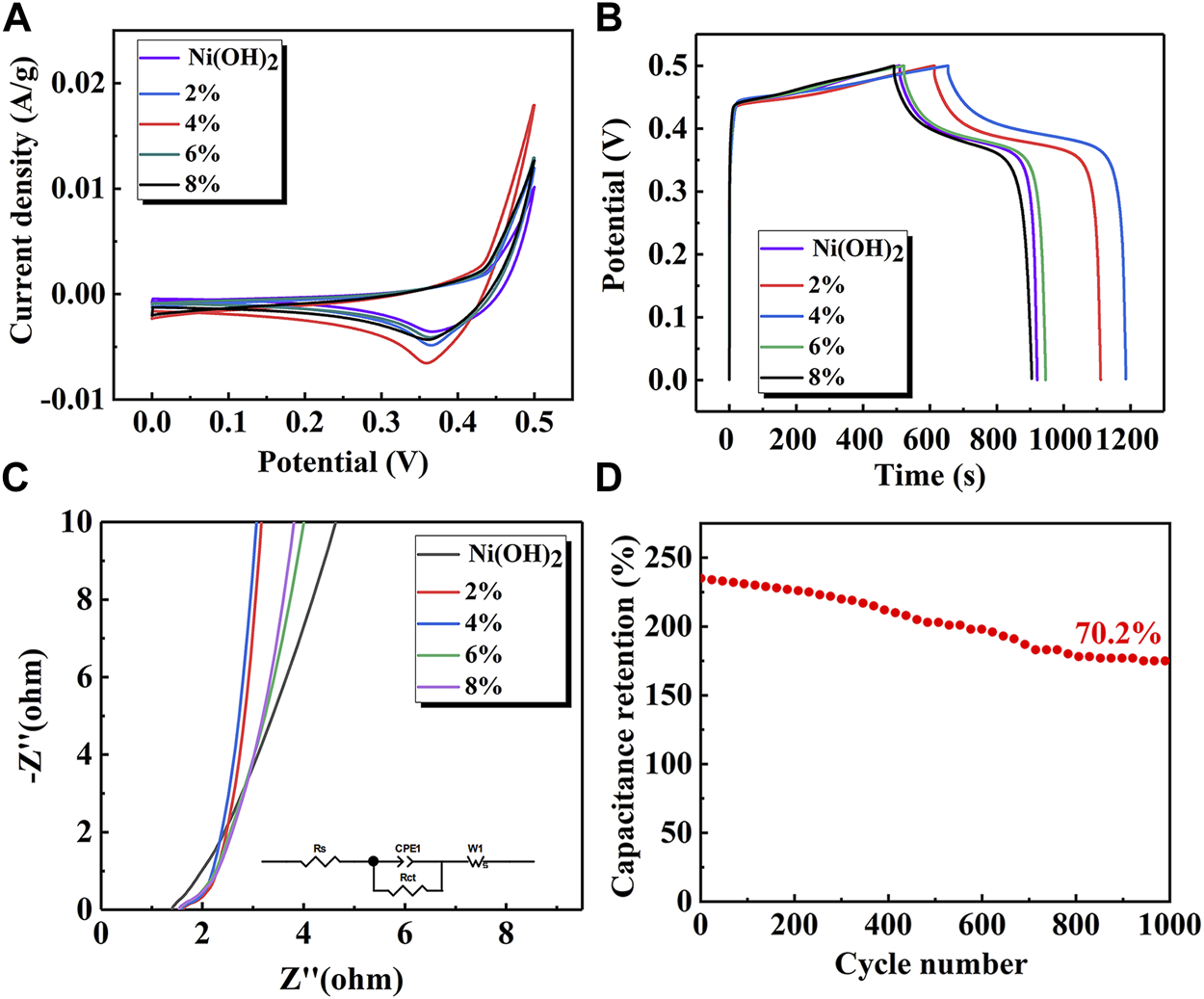 The long cycle performance of the Ni(OH)2/M-MMT nanocomposite with 4% M-MMT at 10 A/g for 1,000 cycles was shown in Figure 5D. The specific capacitance was 175 F/g at 10 A/g after 1,000 cycles, and the capacitance retention rate reached 70.2%.