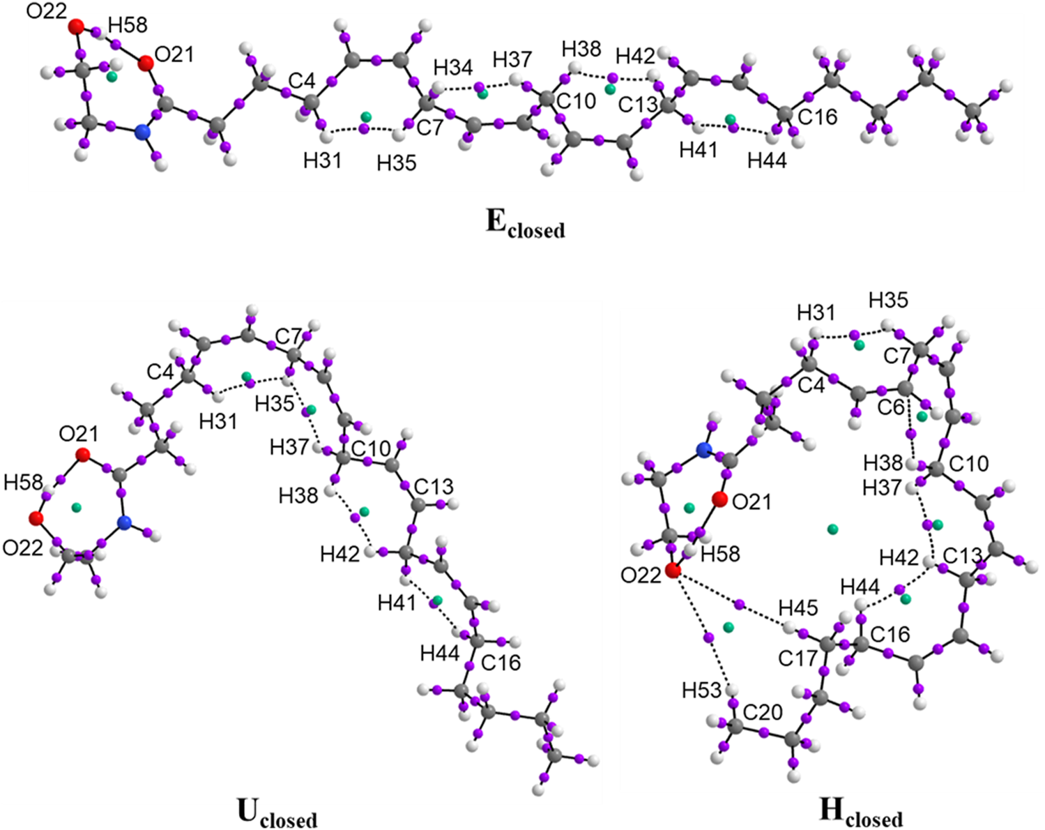 The non-covalent interactions H⋯H in the Alkyl-M region with a value of ρ(r) in the range of 0.011–0.020 a.u. generate the formation of four ring structures with ρ(r) in the RCP of 0.010–0.015 a.u. for the three closed conformers. The interaction energies between H⋯H are very small indicating weak interactions with values of DI of 0.03 a.u. approximately. Only in the conformer Hclosed, is observed the non-covalent interaction C6−H37C10 with values of ρ(r) in the BCP and RCP of 0.0135 and 0.0092 a.u., respectively, and a DI value of 0.045 a.u. In addition, the conformer Hclosed forms an additional ring structure for the interactions between C17H45−O24 and C20H53−O24 with the value of ρ(r) = 0.0013 a.u. in the RCP. On the other hand, the DI values between atoms C5 = C6, C8 = C9, C11 = C12, and C14 = C15 in the Alkyl-M region are 1.77 a.u., corroborating the cis double bonds formation in the three closed conformers. Figure 2 and Supplementary Figure S2 show the molecular graphs of the anandamide conformers. The purple dots represent the bond critical points (BCP) and the green points represent the ring critical points (RCP).