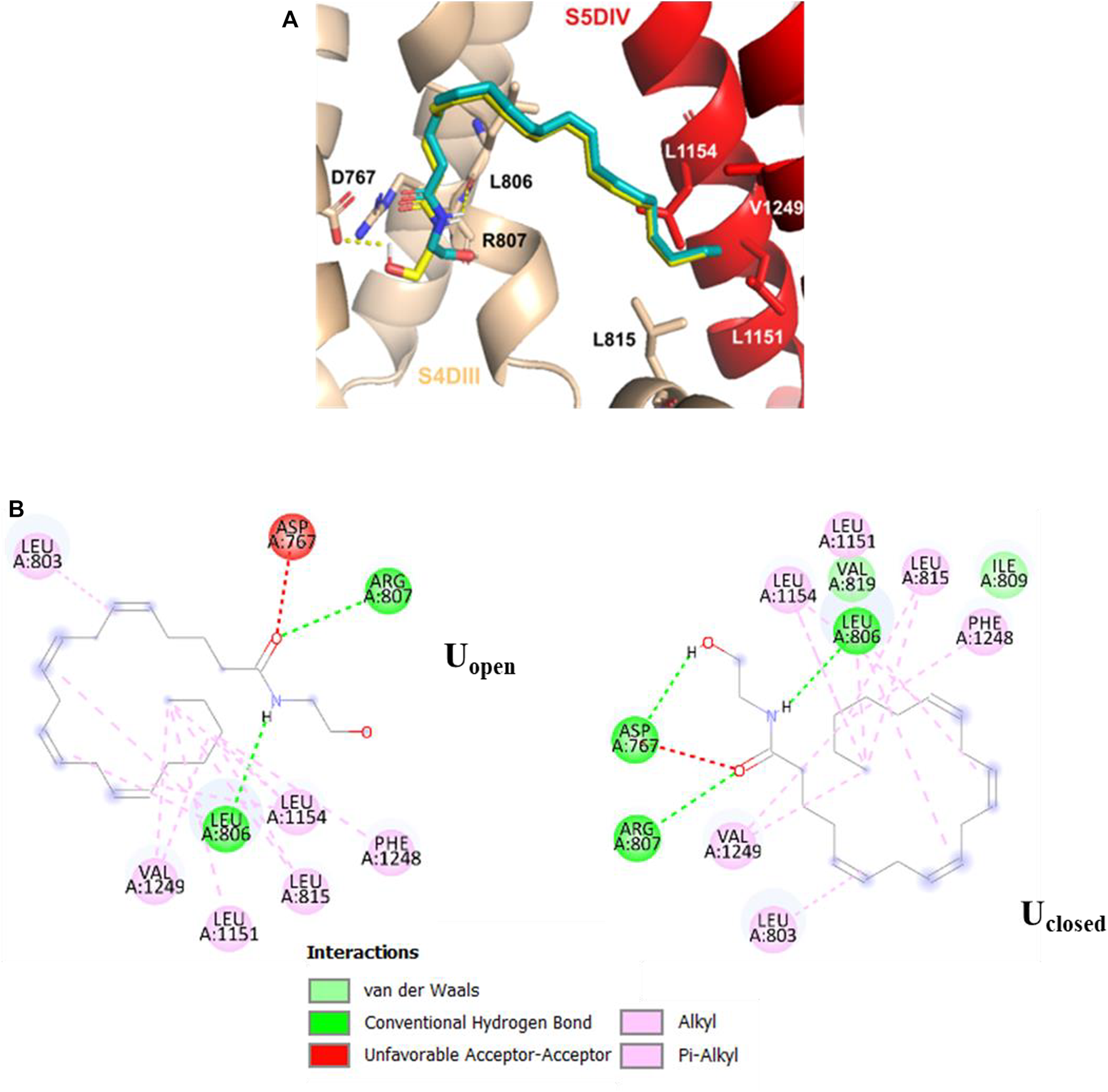 Molecular interactions of Uopen (cyan) and Uclosed (yellow) anandamide conformers with Cav3.2. (A) 3D perspective of S5DIV site, Uclosed and Uopen conformers forming two hydrogen bonds with residues L806 and R807, Uclosed additionally forms a hydrogen bond with D767 (B) 2D perspective interaction for each anandamide conformer in the S5DIV site.