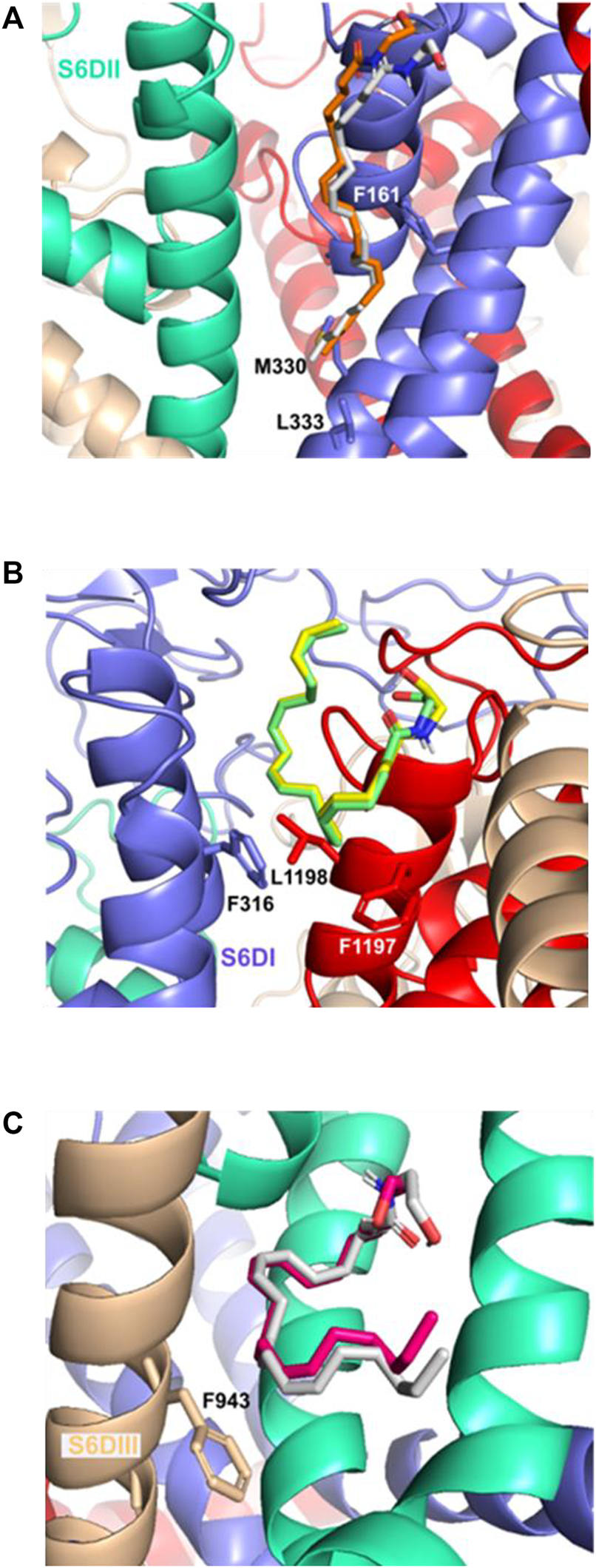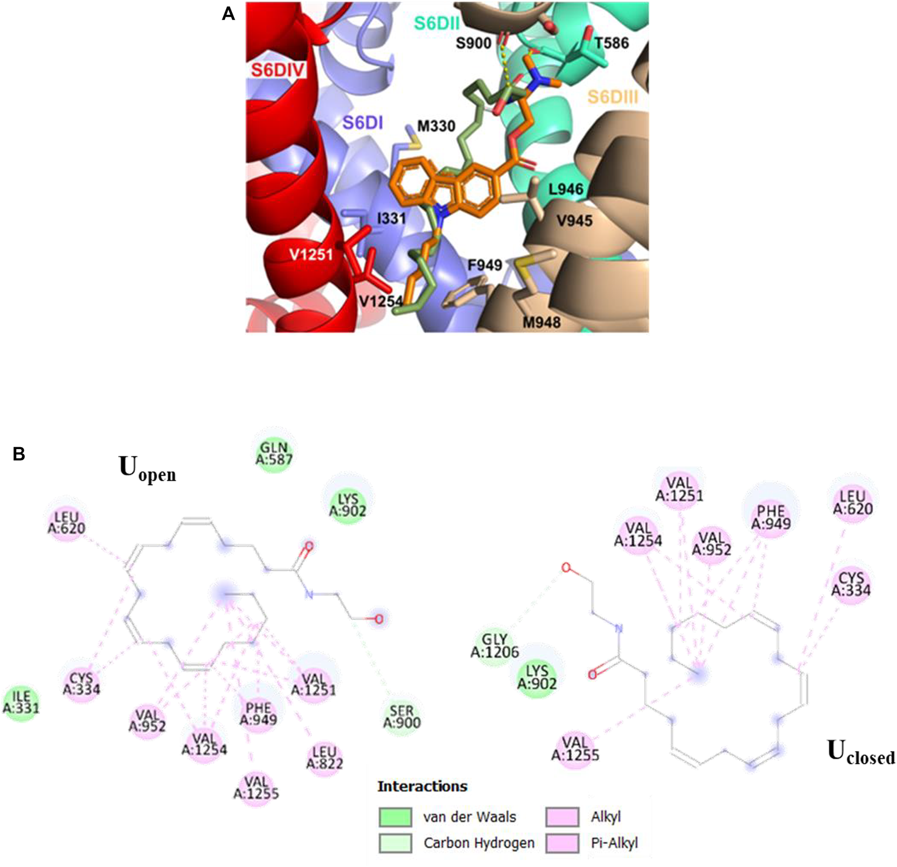 In the S5DIV site (Figure 4), the Uclosed and Uopen conformers place their polar head groups into the S4DIII segment, where the polar interactions are formed with the hydrogen N23−H⋯O of Uclosed and the carbonyl oxygen of L806 (backbone), and the hydrogen O22−H⋯O of Uopen and the carbonyl oxygen of R807 (both residues are located at 2.6 Å from the ligands). Also, is observed an unfavorable acceptor-acceptor interaction with O21 of Uclosed and Uopen conformers and the side chain carbonyl oxygen of D767 residue (Figure 4). The Uclosed conformer forms an additional hydrogen bond, formed by hydrogen O22−H⋯O and the side chain carbonyl oxygen of acidic residue D767, however, this interaction does not contribute to the affinity of the ligand for the calcium channel with interaction energy of −9.2 kcal mol−1 for both conformers. The non-polar portion of both conformers (Uclosed and Uopen) is placed in the S5DIV segment where the hydrophobic residues are located forming alkyl–alkyl interactions with the L815, L1151, L1154, and V1249 residues. In the X-ray structures of the TRPV5, TRPV2, and TRPV1 channels, which are close members of the T-type calcium channels, in complex with econazole (Hughes et al., 2018), resiniferatoxin (Zubcevic et al., 2018), and capsazepine (Gao et al., 2016), respectively, we observed ligand binding sites located in equivalent positions to that defined as the segment S5DIV in the Cav3.2.