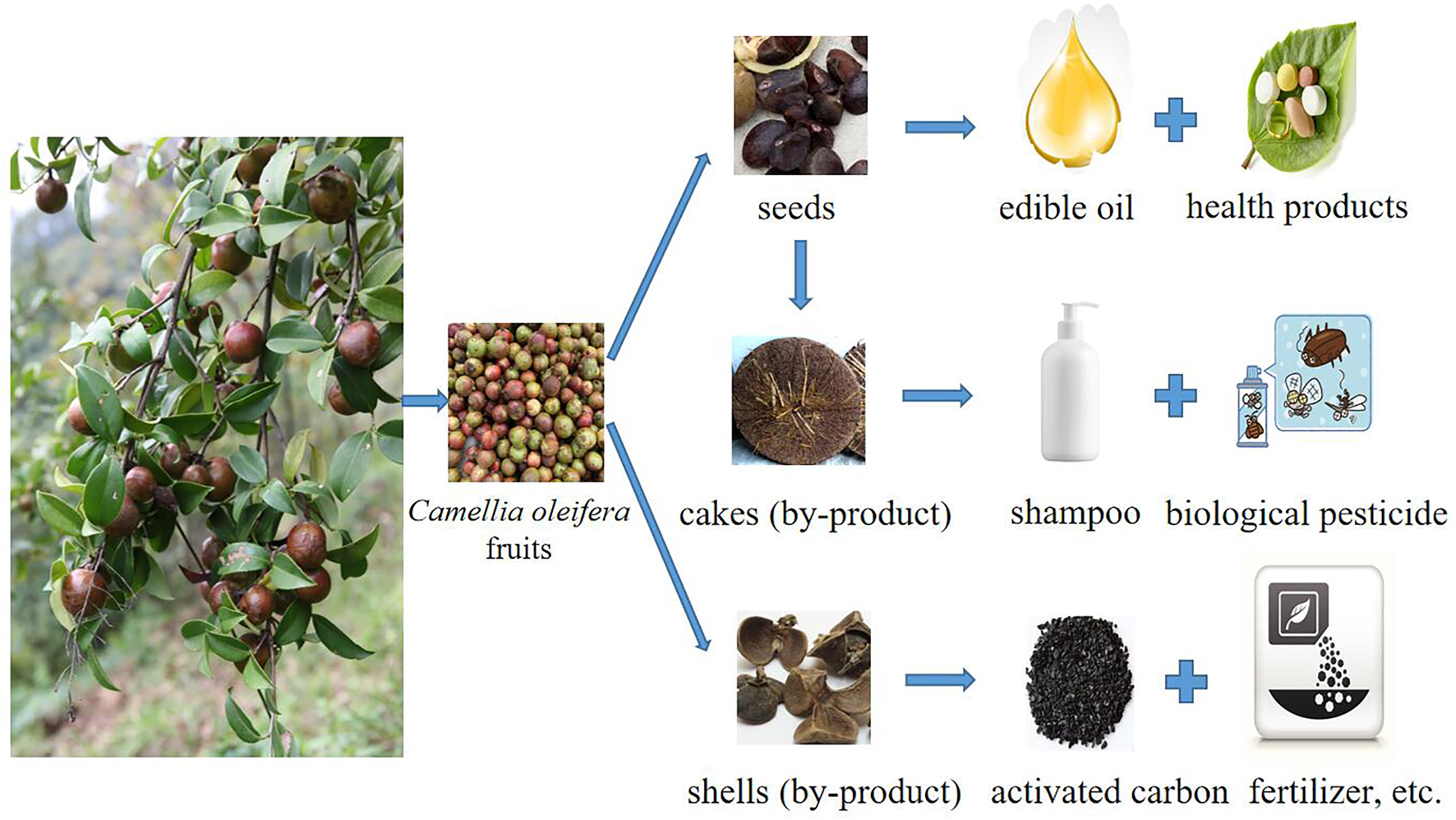 Camellia oleifera is a woody oil tree species unique to China that has been cultivated and used in China for more than 2,300 years. Most biological research on C. oleifera in recent years has focused on the development of new varieties and breeding. Novel genomic information has been generated for C. oleifera, including a high-quality reference genome at the chromosome level. Camellia seeds are used to process high-quality edible oil; they are also often used in medicine, health foods, and daily chemical products and have shown promise for the treatment and prevention of diseases. C. oleifera by-products, such as camellia seed cake, saponin, and fruit shell are widely used in the daily chemical, dyeing, papermaking, chemical fibre, textile, and pesticide industries. C. oleifera shell can also be used to prepare activated carbon electrodes, which have high electrochemical performance when used as the negative electrode of lithium-ion batteries. C. oleifera is an economically valuable plant with diverse uses, and accelerating the utilization of its by-products will greatly enhance its industrial value.