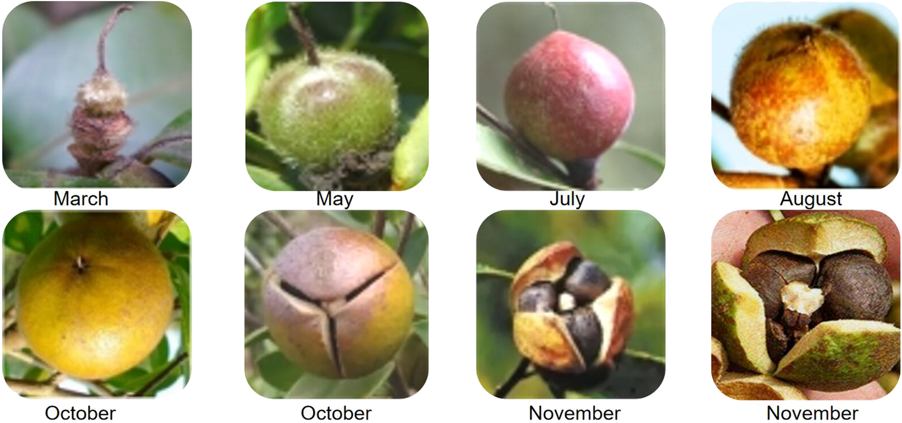 Structural characteristics (A) and morphological changes at different stages (B) of C. oleifera fruit.