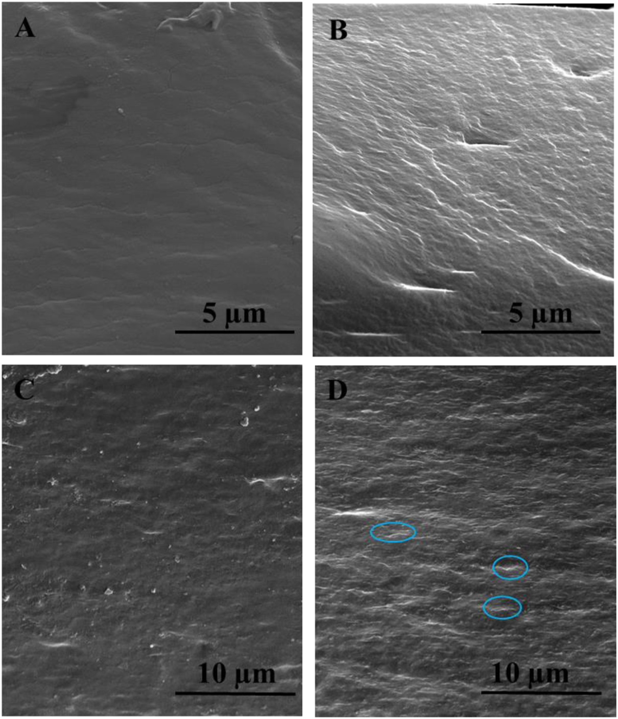 Cross-sectional scanning electron microscopic images of the typically selected samples: (A) pristine CS, (B) CS/B, (C) CS/B/025G/025C, and (D) CS/B/1G/1C. GO sheets are highlighted with circles.