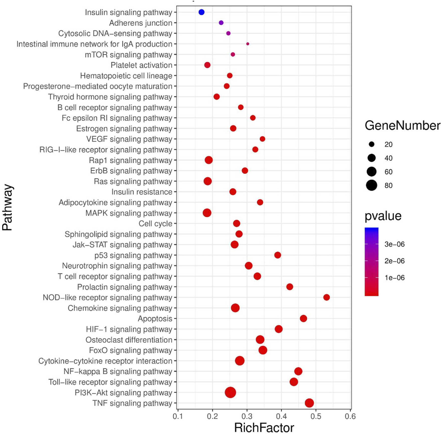 The KEGG pathway enrichment analysis was conducted on the nodes in the network using David’s website to obtain the functional pathways involved in the component action targets of YYFZ powder to modulate diseases, and the enriched pathways were visualized using the advanced bubble map function in OmicShare platform. The results will be compared with the functional pathways involved in the common targets of the two diseases, and a basis for the elaboration of the heterogeneous treatment mechanism of CHD and RA by YYFZ powder will be provided.
