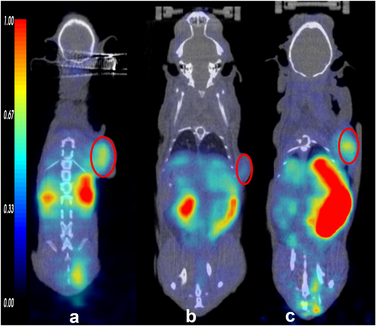 The small animal PET/CT imaging of the tracers (68Ga) Ga-DOTA-FAPI-04 (A), 11C-RJ1101 (B), and 11C-RJ1102 (C) at 60 min. And the tumor was indicated by the red circle.