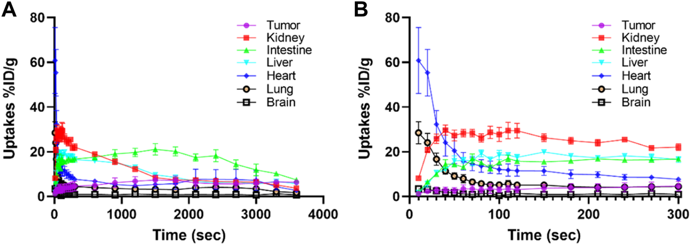 Dynamic time–activity curves of 11C-RJ1102 in the heart, kidney, liver, brain, lung, Intestine, and tumor in U87MG tumor-bearing nude mice. The difference between (A,B) is the ordinate, for (A) the time is from 0 to 3,600 s. And for (B) the time is from 0 to 300 s.