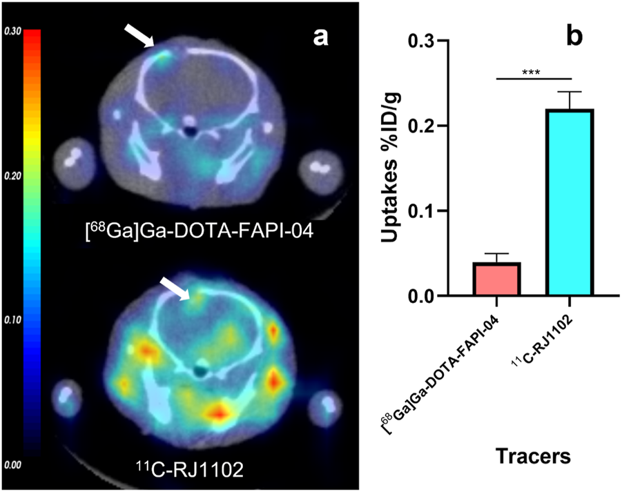 The in vivo distribution experiment of the above tumor model showed that 11C-RJ1102 had stronger lipid solubility. Therefore, the brain uptake of 11C-RJ1102 and [68Ga]Ga-DOTA-FAPI-04 was evaluated in the mouse model of glioma in situ in the follow-up experiment. An interesting finding was that in contrast to the radioactive accumulations in the brain of U87MG tumor xenografts and in the orthotopic model, no differences were observed between the two at 60 min p. i. except for with 11C-RJ1102. A significant difference in the brain was observed at 60 min p. i. In addition to differences in uptake in glioma in situ, there were also significant differences in the uptake of the two molecular probes in other parts of the brain. The likely reason is that the blood–brain barrier is disrupted, resulting in significant uptake of molecular probes in the brain. At the same time, due to the great difference in the lipid solubility of [68Ga]Ga-DOTA-FAPI-04 and 11C-RJ1102, the metabolism of 11C-RJ1102 in other regions of the brain is different. Further studies of this observed phenomenon are ongoing.