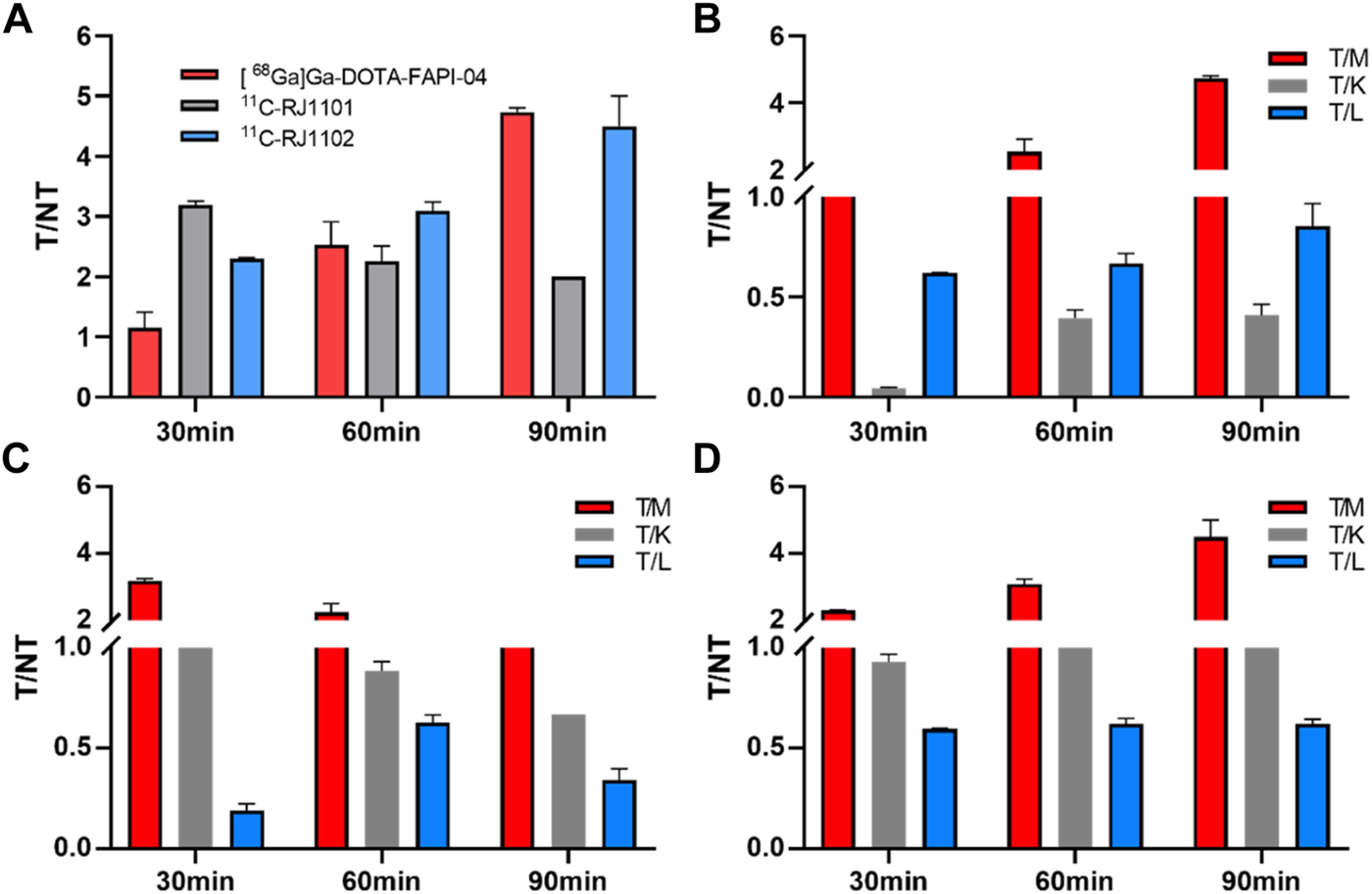 The T/NT ratios in U87MG tumor-bearing nude mice of (68Ga) Ga-DOTA-FAPI-04, 11C-RJ1101, and 11C-RJ1102. (A) the T/M ratios of (68Ga) Ga-DOTA-FAPI-04, 11C-RJ1101 and 11C-RJ1102 after 30, 60, and 90 min p.i. (B) the T/M, T/K, and T/L ratios of (68Ga) Ga-DOTA-FAPI-04 after 30, 60, and 90 min p.i. (C) the T/M, T/K, and T/L ratios of 11C-RJ1101 after 30, 60, and 90 min p.i. (D) the T/M, T/K, and T/L ratios of 11C-RJ1102 after 30, 60, and 90 min p.i.