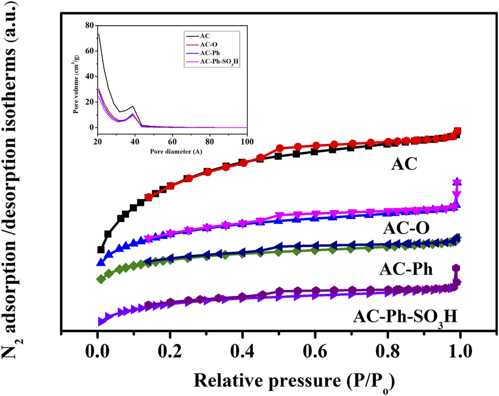 The N2 adsorption-desorption isotherms and pore size distribution of AC-Ph-SO3H and its precursors were shown in Figure 6, which were all belonged to type IV class and showed mesoporous structure indicating that the presence of a uniform mesoporous structure for AC-Ph-SO3H and its precursors. The surface areas were calculated with standard BET equation, which was shown in Table 5. According to Table 5, the BET surface area and pore volume changed greatly due to the destruction of the pore structure by the oxidation process, while the halogenated benzene modification and sulfonation process had relatively less effect on the pores. After modification, the obtained AC-Ph-SO3H still had a high specific surface area, of which was up to 472 m2/g, which provided the possibility of application in acidic catalytic systems combined with the high -SO3H density.