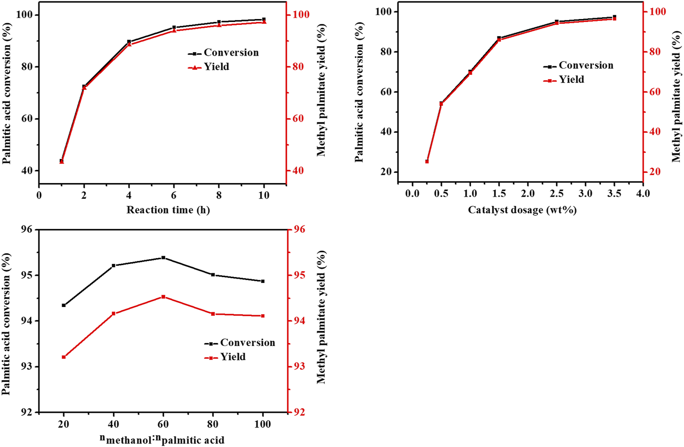 The catalytic performance of AC-Ph-SO3H in the preparation of biodiesel from methylation of palmitic acid was investigated. The conditions of reaction time, catalyst dosage and acid-alcohol molar ratio during the methylation reaction were studied. The typical catalytic process was as follows: 0.01 mol of palmitic acid, 0.4 mol of methanol and catalyst accounted for 2.5 wt% of palmitic acid was added into a three-necked flask equipped with a thermometer and a reflux condenser for 6 h at reflux temperature.