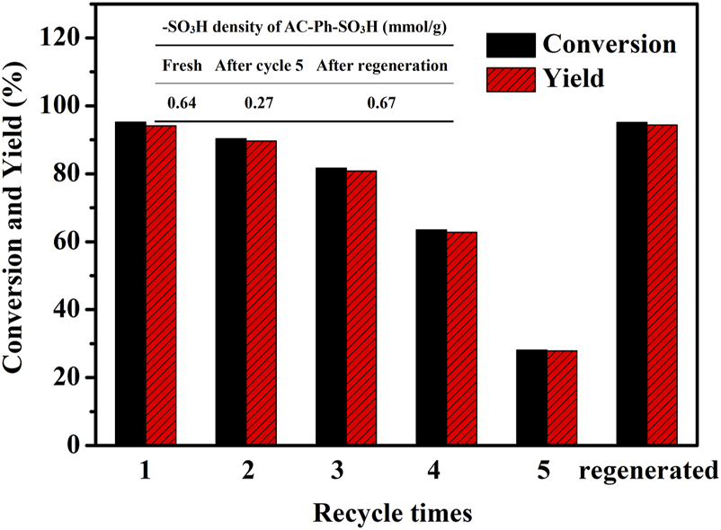 The stability of the prepared AC-Ph-SO3H was investigated at reflux temperatures of different polar solvents. The shedding of -SO3H groups under reflux treatment for 10 and 20 h was investigated respectively, and the results were shown in Table 3. As shown, the stability of the -SO3H group on the surface of AC-Ph-SO3H gradually decreased with the enhancement of solvent polarity. After refluxing in cyclohexane for 20 h, the -SO3H content of AC-Ph-SO3H decreased from 0.64 mmol/g to 0.58 mmol/g with a loss of only 9.4%; while refluxing in acetic acid for 20 h, the -SO3H content was only 0.25 mmol/g with the loss as high as 60.9%. The reason was that the -SO3H groups on the surface of the prepared materials were bonded to the surface aromatic rings in the form of C-S bonds, and when the polarity of the solution increased, the small molecular aromatic rings were more likely to fall off on the surface of the materials, resulting in a decrease in the content of -SO3H groups.