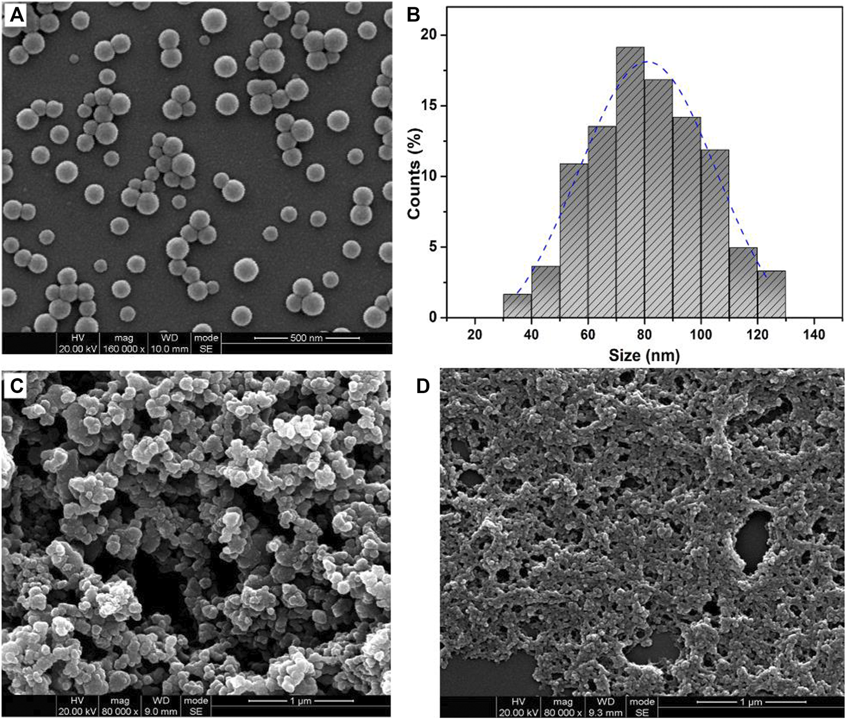 The SEM morphology (A) and corresponding size distribution histogram (B) of polymeric nanoparticles obtained via the solvent exchange–induced self-assembly of pristine PAE-NC, and the morphology of Zn2+(C) and Cu2+(D) cross-linked PAE-NC self-assembled nanostructures.