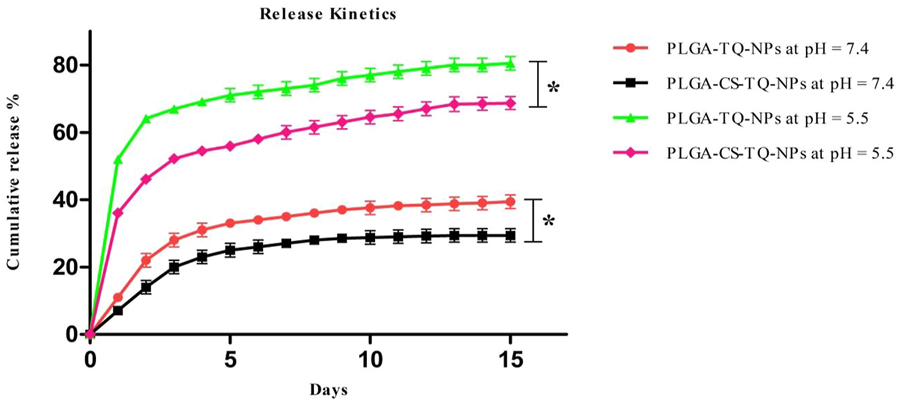 Illustrates the in-vitro release profile of PLGA-TQ-NPs and PLGA-CS-TQ-NPs at pH = 7.4 and pH = 5.5.