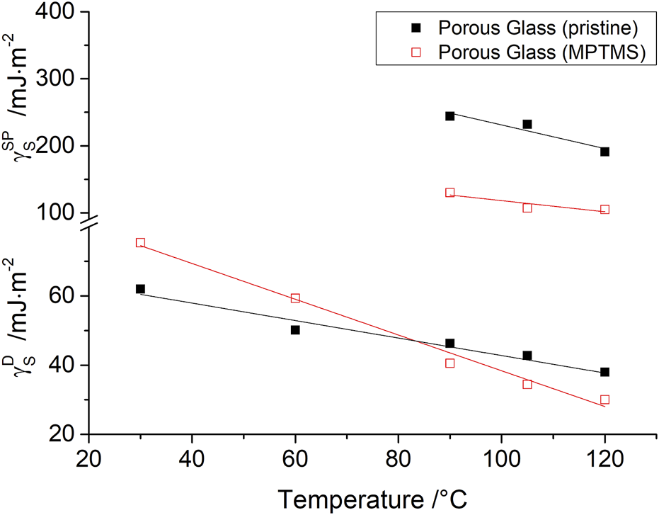 Values of for pristine silica were found in the range from 191 mJ/m2 to 244 mJ/m2 and they are, therefore, larger by a factor of six than the disperse component at the corresponding temperature. Surface modification with MPTMS uniformly reduces for all temperatures investigated. Although this is significantly reduced, it still exceeds by a factor of 2.5.