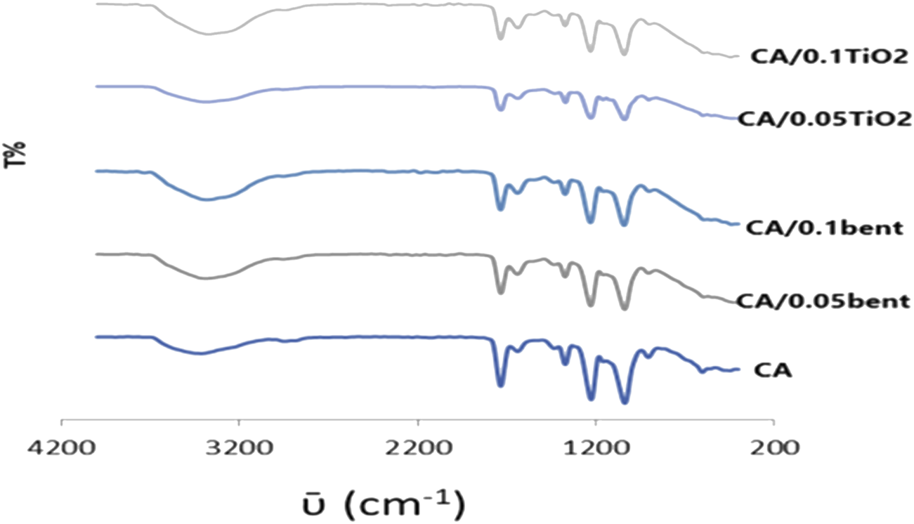 The FT-IR spectrum of the CA membrane displays bands at 1732vs, 1224vs., and 1035vs. cm-1due to νC=O acetyl, νC-O acetyl, and νc-o-c pyranose ring, respectively as shown in Figure 1. The νOH is traced as a broad medium band at 3,413 cm−1 while that due to ν-CH2- appeared as a weak band at 2,945 cm−1. The spectra display redshifts of νOH from 3,413 cm−1 in the CA membrane to 3,379, 3,385, 3,387, and 3,374 cm−1at CA/0.10bent, CA/0.05bent, CA/0.05TiO2, and CA/0.1TiO2 membranes, respectively. The bands at 400–600 cm−1 characteristic for Si-O and the weak bands at 1995–2,359 cm−1 are attributed to Ti–O stretching vibration and O–Ti–O lattice due to TiO2-polymer (George et al., 2014).