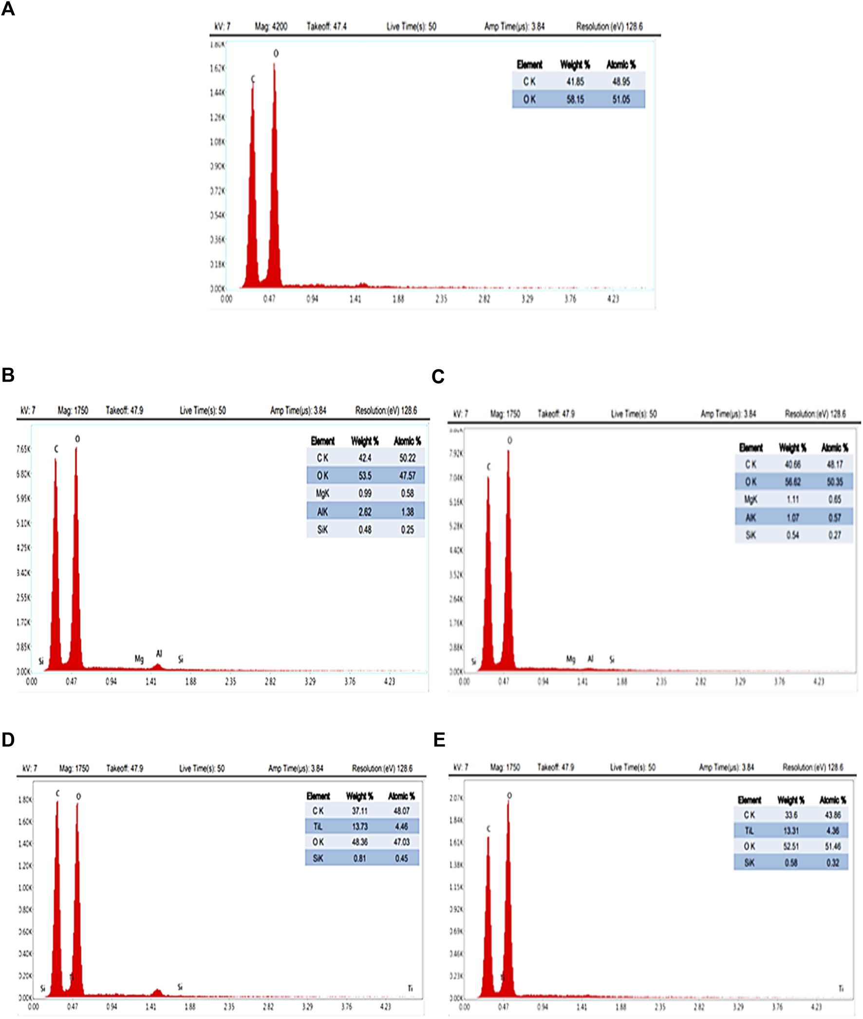 FIGURE 3. EDX for prepared nanocomposite membranes (A) neat CA, (B) CA/0.05 bent, (C) CA/0.1 bent, (D) CA/0.05 TiO2 and (E) CA/0.1 TiO2.