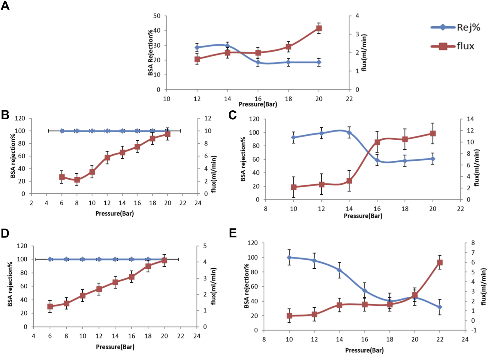 The effect of variation of the pressure on bovine serum albumin (BSA) rejection% and water permeation flux through the CA, CA/bent, and CA/TiO2 explored in Figure 7A and measured at various applied pressure (12–20 bar). The data shows that upon increasing the pressure from 12 to 20 bar, the flux increased from 1.6 to 3.3 mL/min with decreasing in BSA rejection percentage from 30% to 18.5% at 20 bar. The permeate flux through CA/0.05bent (under applied pressure in the 6–20 bar range is illustrated in Figure 7B. While increasing the pressure from 6 to 20 bar, the flux increased from 2.6 to 9.5 mL/min with the stability of BSA rejection percentage around 100%. The data shown in Figure 7C shows that the permeate flux is increased from 2.16 to 11.5 mL/min upon increasing the pressure from 10 to 20 bar. While the BSA rejection percentage first increases to 100% at 14 bar and then decreases to 61% at 20 bar. The water permeation flux through CA/0.05TiO2 was increased from 1.25 to 4.1 mL/min with 100% BSA rejection upon increasing the applied pressure from 6–20 bar, as shown in Figure 7D. The permeate flux through the modified membrane CA/0.10TiO2 was measured at various applied pressure from (10 bar–22 bar). The flux increases from 0.5 to 6 ml/min with the decrease of BSA rejection percentage from 100% to 31.7% at 20 bar, as shown in Figure 7E. Figure (Yampolskii, 2012) shows that, as the applied pressure increases, the permeate flux for all prepared membranes increases with decreasing in the BSA rejection except for CA/0.05bent membrane. CA/0.05bent membrane exhibits the highest water flux (9.5 ml/min) with stable BSA rejection of 100%, showing the most efficient UF membrane. The membrane’s performance toward BSA removal from wastewater shows good enhancement due to the membrane’s moderate porosity having high hydrophilic nature and highest mechanical behavior.