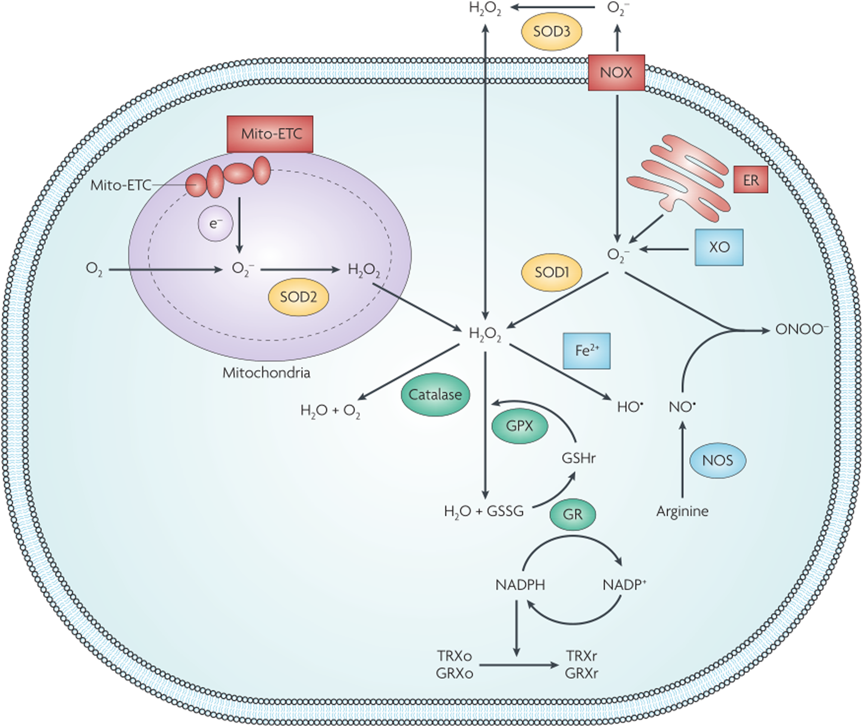 Schematic illustration of cellular redox homeostasis. GPX, glutathione peroxidase; GR, glutathione reductase; GRXo, glutaredoxin (oxidized); GRXr, glutaredoxin (reduced); GSHr, glutathione (reduced); GSSG, glutathione (oxidized); TRXo, thioredoxin (oxidized); TRXr, thioredoxin (reduced); XO, xanthine oxidase. Reproduced with permission from (Trachootham et al., 2009) Copyright (2009) Nature Research.