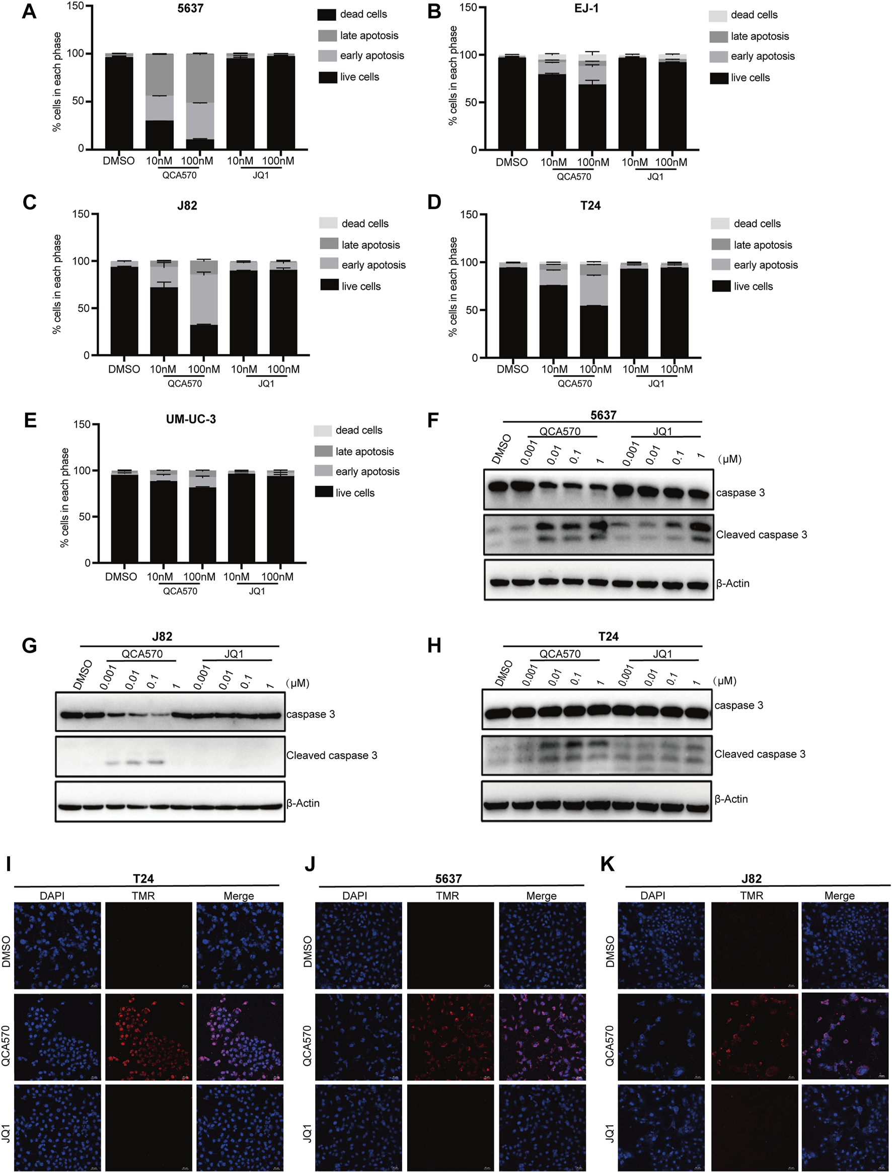QCA570 induced cell apoptosis and cell cycle arrest (A–E) EJ-1, 5637, J82, UMUC-3 and T24 cells were treated with QCA570 or JQ1 for 72 h, and cell apoptosis was determined by Annexin V-FITC/PI staining and flow cytometry. Percentages of apoptosis cells were plotted using GraphPad Prism 9.0. Data were presented as means ± SEM. (F–H) 5637, J82 and T24 cells were treated with different concentrations of QCA570 or JQ1 for 72 h. Western blot analysis of the expression of cleaved caspase-3. (I–K) Apoptosis was analyzed by TUNEL staining. The red dots represented apoptotic cells, and DAPI (blue) indicated cell nuclei. Magnification, × 10.