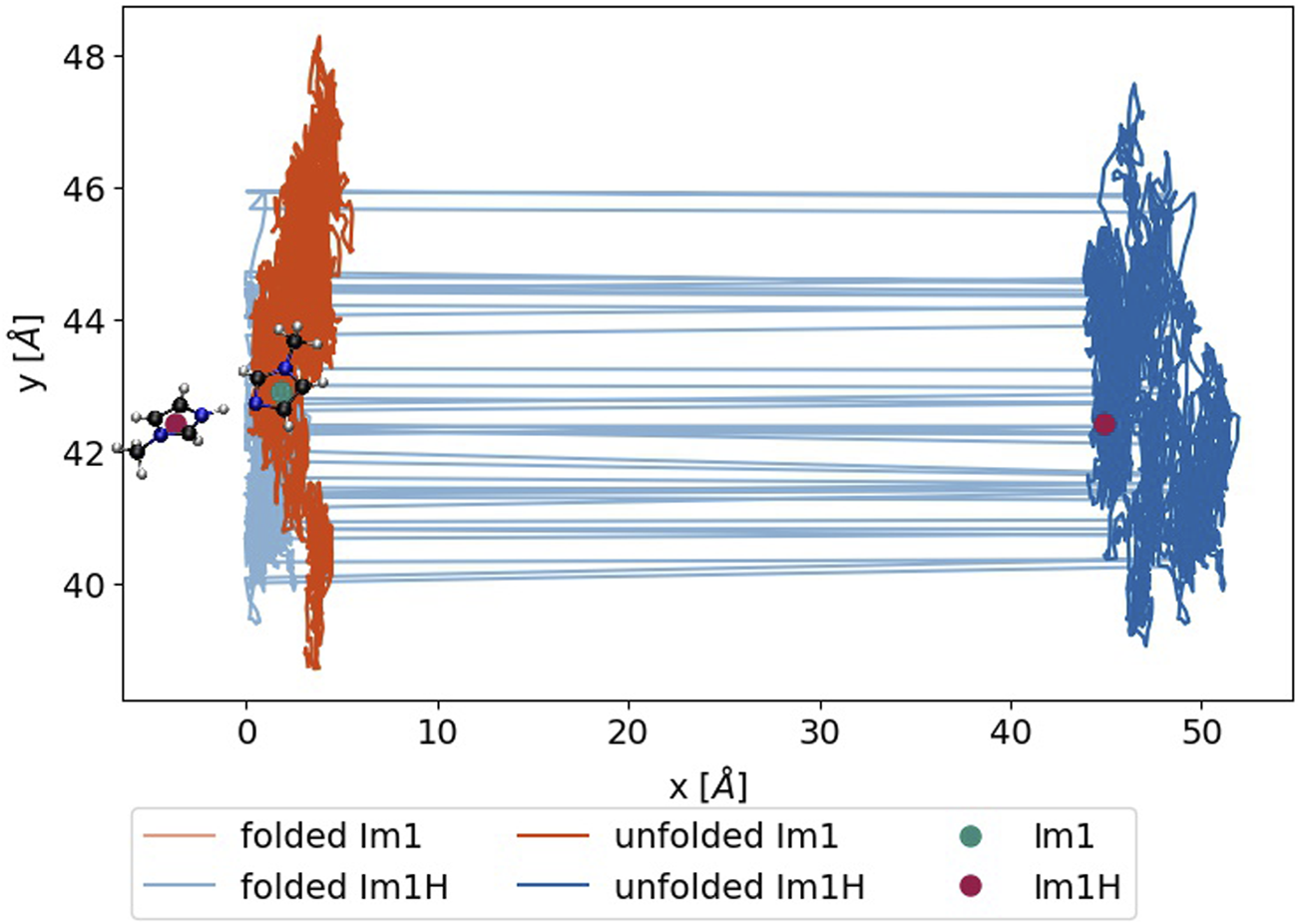 The ProtexTemplates class is used to gather the additional information needed for the simulation. The user may specify which transfer reactions should occur by specifying the residue names, the maximum distance, and the probability of this reaction. This way, the back-and-forth reaction of, for example, Im1H+ + OAc− → Im1 + HOAc, can be defined independently of the reaction Im1 + HOAc → Im1H+ + OAc−. Additionally, the atom name of the donor/acceptor atom needs to be specified. This would be the hydrogen for Im1H+ and the nitrogen for Im1 or the hydrogen of the acetic acid and both oxygens of the acetate. An example for the concrete definition of these variables can be found in the SI.