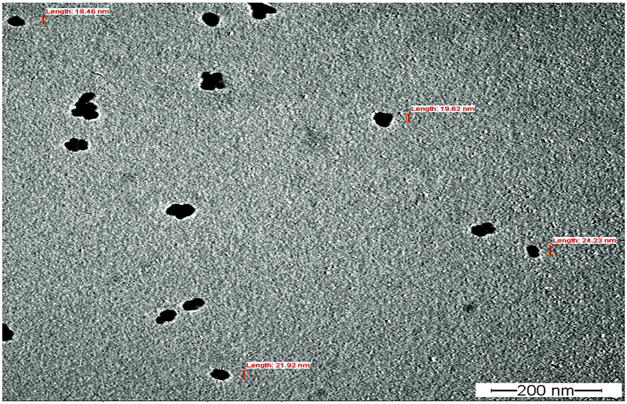 TEM analysis revealed the formation of polydisperse and roughly spherical CuO-NPS which were free from agglomeration with the 20–40 nm size range (average particle size is 28 nm). The CuO-NPs as water suspension are slightly agglomerated due to their interaction with water and due to such inter-particle interactions viz. van der Waals, electrostatic and magnetic forces, etc. Previously, similar results of biogenic CuO-NPs were reported by several studies (Ida et al., 2010; Cheng and Walker, 2010; Chandra et al., 2014; Sagadevan and Koteeswari, 2015; Kimber et al., 2020; Singh et al., 2019) as observed in TEM. John et al. (2021) reported the TEM micrographs of CuO-NPs from marine bacteria and reported the synthesis of monodispersed, spherical/ovoidal NPs of 10 nm–70 nm size with ∼40 nm average size. The irregular shape can be attributed to bacterial metabolites on the surface of nanoparticles as stabilizing and reducing agents. Bukhari et al. (2021) reported the Streptomyces sp. mediated Cu-NPs synthesis of uniform and spherical nanoparticles (1.72–13.49 nm) in the TEM images. Krishna et al. (2020) synthesized CuO nanoparticles from Cinnamomum malabatrum aqueous leaf extract and the TEM revealed spherically shaped CuO-NPs with 11 nm–24 nm size range which was also in close agreement with the present study.