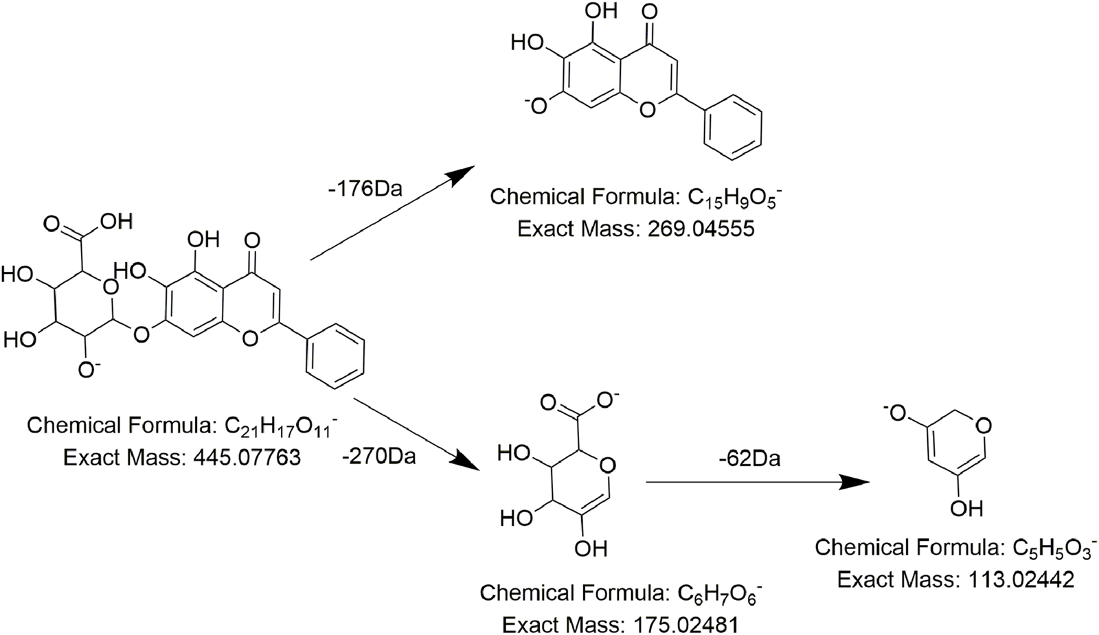 Analogously, compound FL20 displayed a precursor ion at m/z 444.0766 and presented typical fragment ions at m/z 269 after a 177Â Da (C6H8O6) neutral loss. Combining with the daughter ions at m/z 113 and m/z 175, we believed that there is a glucuronic-group substitution (C6H8O6). So, m/z 269 was reasonably inferred to be the nucleus of compound FL20, which was the flavone nucleus. According to the literature (Wu et al., 2005), it was speculated to be baicalin (Figure 5), which was reported for the first time in PMR-related literature. Compound FL19 was eluted at 16.1Â min with the precursor ion at m/z 447.40493, and a comparison with compound FL20 revealed its molecular weight to be 2 Da lower. The same as compound FL20, after losing 177Â Da (C6H8O6), it generated the fragment ion at m/z 271 (269Â Da +2Â Da) and had fragment ions at m/z 175 and m/z 113. According to the literature, it was considered to be naringenin-7-O-glucuronide (Rui et al., 2020).
