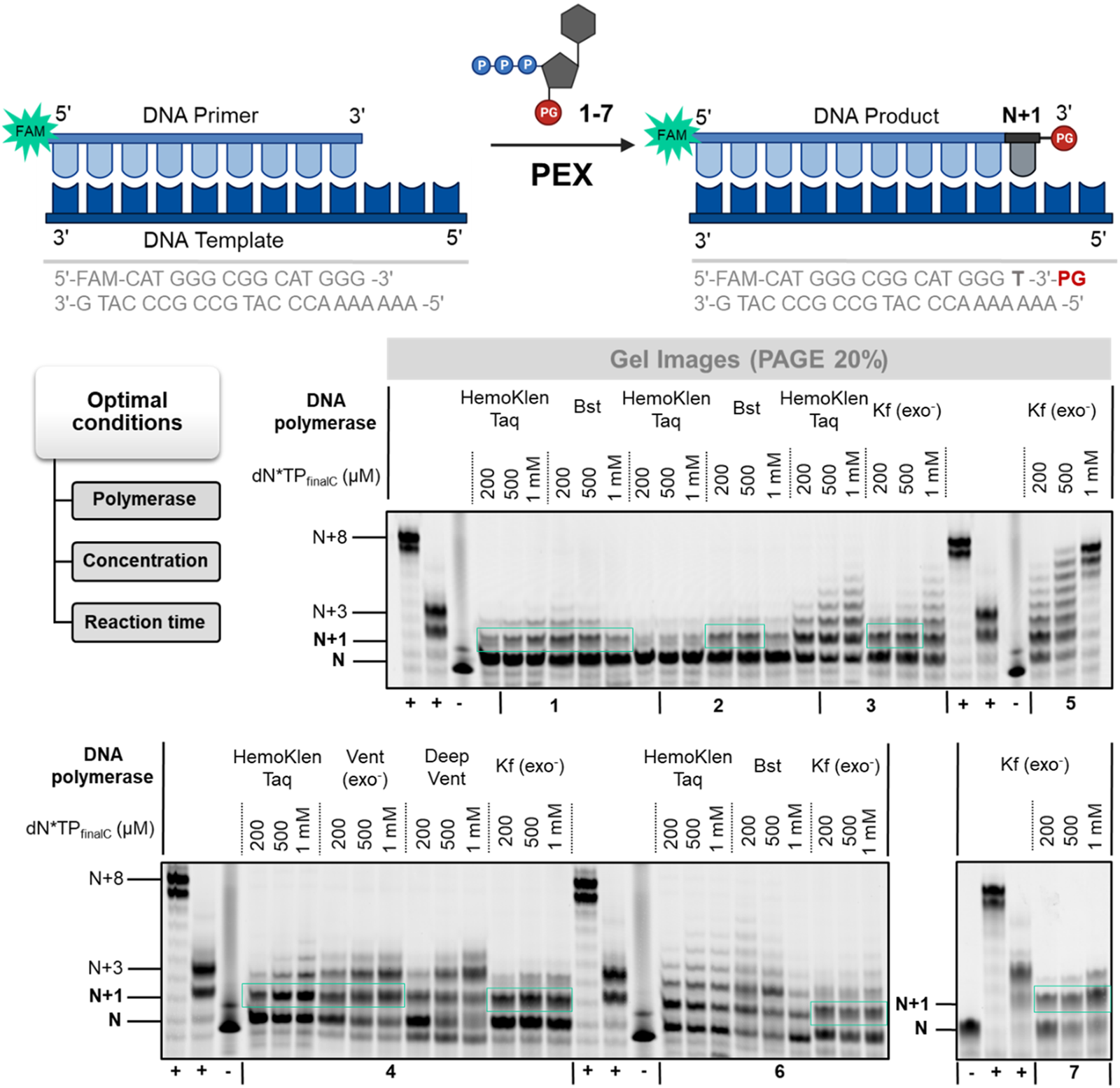 In order to improve the yield of N+1 product formation, we considered generating a mutant of the KOD polymerase that would tolerate LNA nucleotides additionally modified at position 3’ of the sugar moiety. We thus considered engineering a KOD polymerase variant that contained one point mutation at the level of the exonuclease domain (P179S) and one in the thumb section (L650R). Point mutations were introduced at these sites because these have been recognized as facilitating the incorporation of sugar-modified nucleotides (Bergen et al., 2013; Larsen et al., 2016; Hoshino et al., 2020; Hajjar et al., 2022) and KOD was chosen given its tolerance for LNA nucleotides (Veedu et al., 2010). With this KOD mutant HP1.C2 at hand (courtesy from Roche), we carried out PEX reactions with blocked nucleotides 1–7 as well as unblocked LNA-TTP using similar conditions as described above.