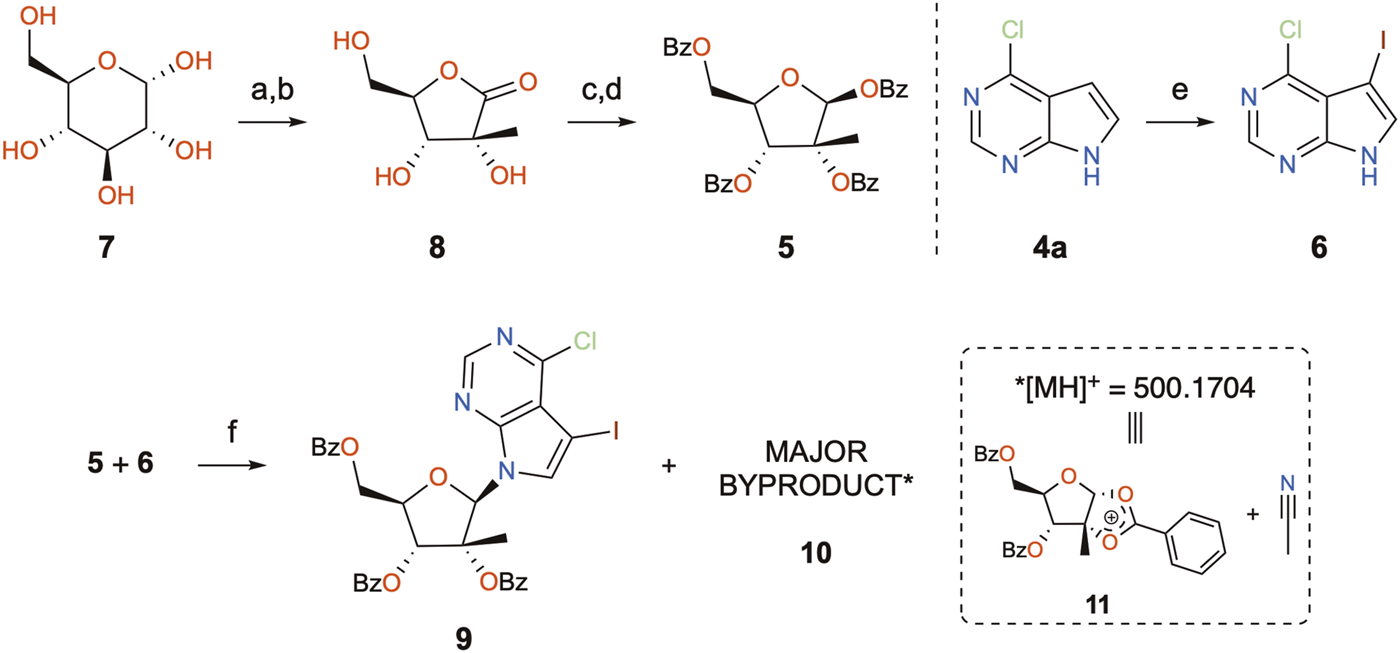Starting with the preparation of perbenzoylated 2-methyl-ribose (5) in house, D-(+)-glucose (7) was subjected to the Amadori reaction (Hotchkiss et al., 2006) and further treated with calcium chloride (Steinhardt and Eastgate, 2013) to give 2-methyl-D-ribonic-γ-lactone 8 (Scheme 2). Perbenzoylation of the latter prior to reduction of the lactone using lithium tri-t-butoxyaluminium hydride and benzoylation of the resulting crude hemiacetal furnished the desired peracylated 2-methyl-ribose 5 (Zhou et al., 2016). This 4-step sequence could be performed on a multigram scale without the use of chromatographic purification. The planned coupling partner 6 was prepared by iodination of 6-chloro-7-deazapurine 4a (Song et al., 2011). With the key N-glycosylation reaction partners 5 and 6 in hand, Hocek’s protocol was followed, giving the desired product (9) in 48% yield (Nauš et al., 2012). On repeating the reaction, however, we only achieved low yields, around 20%. The addition of molecular sieves did not greatly improve the outcome (30% yield). Intrigued by these results, the reaction mixture was analyzed in detail. Chromatographic analyses of the reaction mixture revealed the presence of a major by-product with an ion mass ([MH]+) of 500.1708. Being devoid of isotopic peaks that would arise from chlorine present in 6, potential deazapurine derivatives were dismissed. Furthermore, considering that protonated species are recorded ([MH]+, and the ammonium ion [MNH4]+), the corresponding molecular mass would be equal to 499, which would imply an odd number of nitrogen atoms present in the structure of the by-product (Pellegrin, 1983). As a consequence, accounting for all the reagents present in the reaction mixture that possess an odd number of nitrogen, and having excluded deazapurine derivatives, the only remaining candidate would be the solvent, acetonitrile. In consideration of the reaction intermediates generated under the reaction conditions, the activated riboside oxonium (11) would be the most likely reactive intermediate, and the combined masses of 11 and acetonitrile indeed had the theoretical protonated ion mass of 500.1704, the experimental data (m/z 500.1708) being within an excellent error margin (<1 ppm).