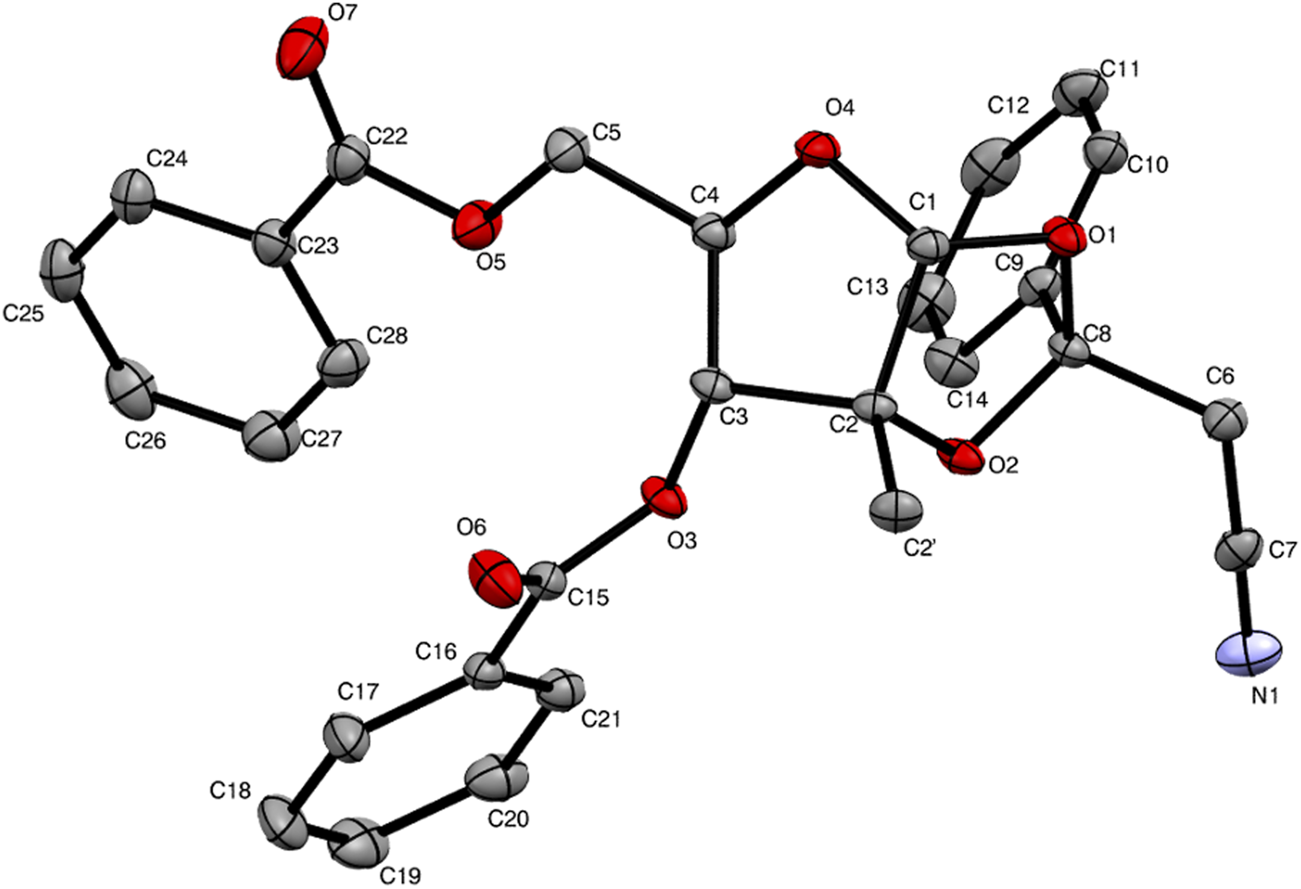 The by-product was further isolated in order to perform a full characterization and try to establish the causes for its occurrence. Chromatographic purification was successfully achieved, yielding a pure product with the expected mass, as examined by UPLC-HRMS analysis. The compound was thus subjected to a series of NMR experiments (please see Supplementary Material for full details), which revealed that acetonitrile was indeed connected to the 1,2-O-ethylidene moiety of 3,5-dibenzoyl-2-methylribose through its α-carbon. The structure of by-product 10 shown in Figure 2 has the name ((3aR,5R,6R,6aR)-6-(benzoyloxy)-2-(cyanomethyl)-6a-methyl-2-phenyltetrahydro-furo[2,3-d][1,3]dioxol-5-yl)methyl benzoate. Crystals of 10 suitable for X-ray crystallography diffraction experiments were also produced, which unequivocally confirmed the proposed structure, also highlighting the single stereochemistry at the ketal position, defined as R (Figure 3).