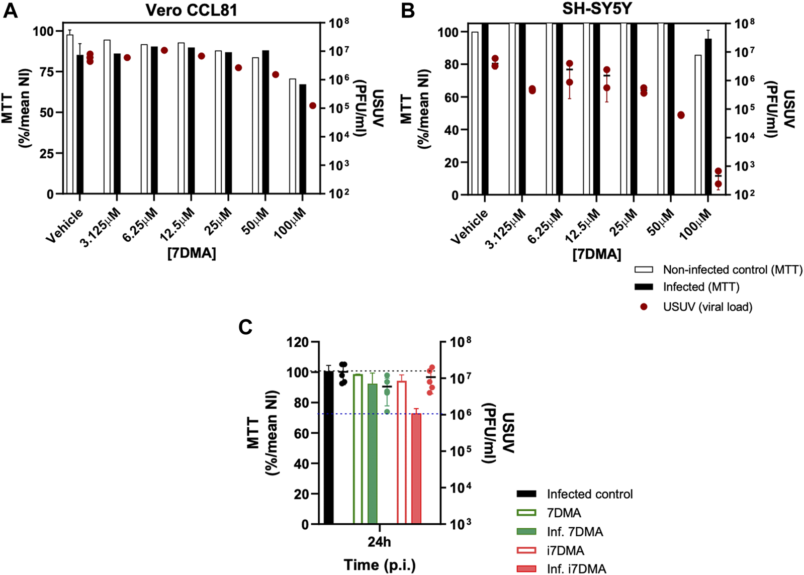 Antiviral effect of 7DMA (2) and i7DMA (13) against USUV and cell viability assessments. (A–B) Dose-dependent inhibition of USUV replication by 7DMA. Vero CCL81 or SH-SY5Y cells were infected and treated with vehicle or 7DMA in concentrations ranging from 3.1 to 100 µM. Cell culture supernatant was collected at 48 h post-infection for the assessment of infectious viral load. Cell viability was assessed using the MTT assay. The left Y axis represent the percentage of viable cells relative to non-infected vehicle-treated controls (NI, 100%) (white bars) and infected and treated cells (black bars). The right Y axis represent viral load results expressed in plaque-forming units (PFU/ml) of culture supernatant, presented as red circles. (C) Cytotoxic effect of i7DMA in infected cells. Vero CCL81 cells were infected with USUV and treated with vehicle (black bar), 7DMA (green bar) or i7DMA (orange bar) at the concentration of 10 µM; non-infected Vero CCL81 cells were treated with 7DMA (green outlined bar) and i7DMA (orange outlined bar) at the same concentration. Cell culture supernatant was collected at 24 h post-infection for the assessment of infectious viral load (green and orange circles for 7DMA and i7DMA, respectively). Cell viability was assessed as described above. Data are representative of two or more independent experiments and indicate mean ±SE (n = 2 to 5).