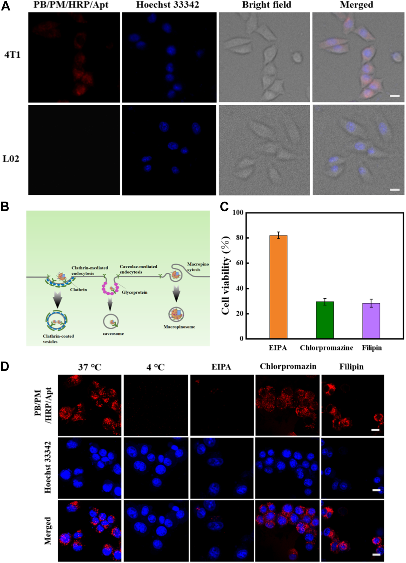 In vitro study of endocytosis mechanism of PB/PM/HRP/Apt. (A) Cellular internalization of PB/PM/HRP/Apt on 4T1 cells and L02 cells. (B) Schematic representation of clathrin-mediated endocytic pathway, caveolae mediated endocytic pathway, and macropinocytosis. (C) Cytotoxicity data after adding different inhibitors. (D) CLSM images of PB/PM/HRP/Apt in 4T1 cells pretreated with various endocytosis inhibitors (EIPA, Chlorprozine, Filipin) and at 37°C or 4°C. Scale bar: 10 μm.