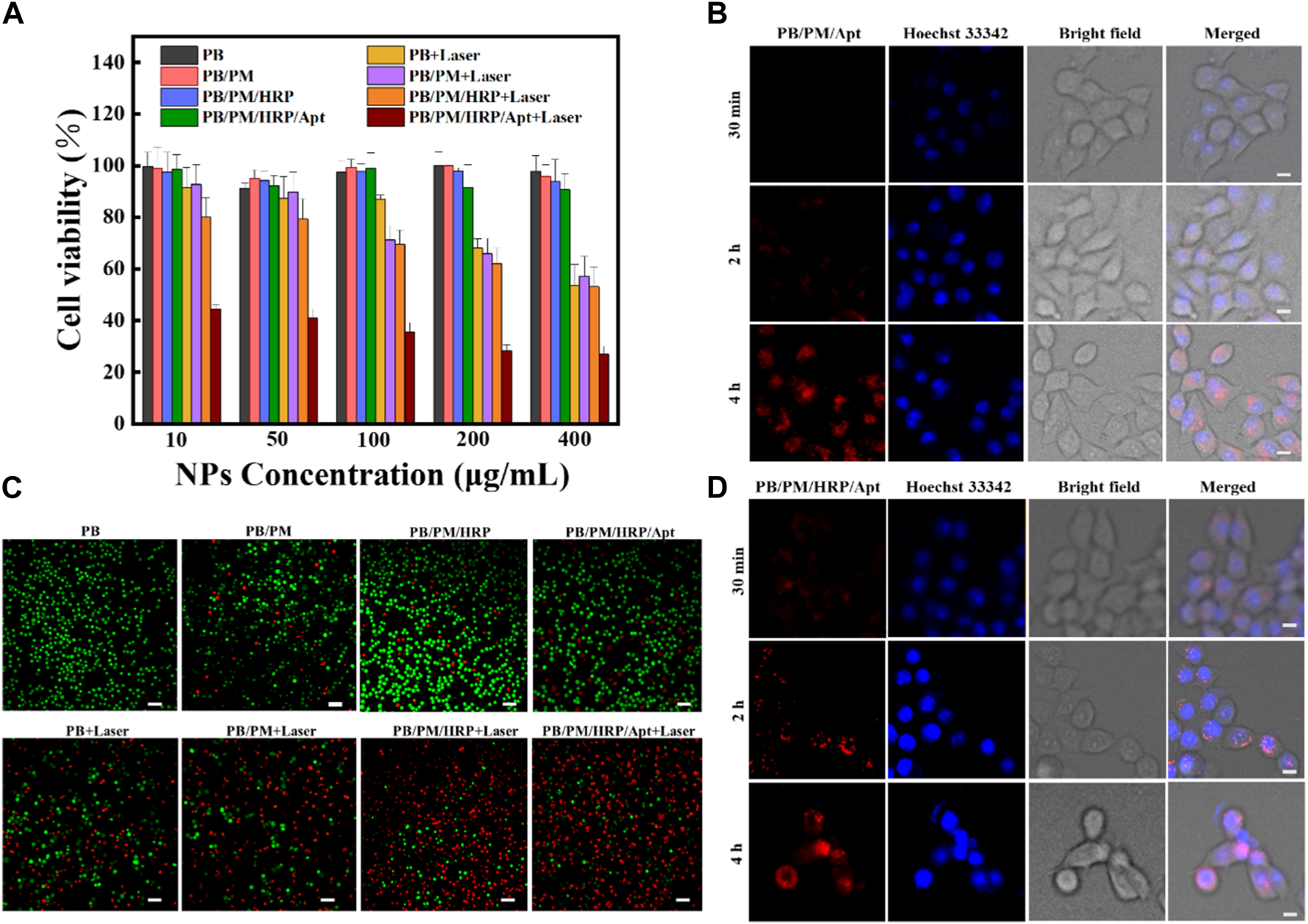 In vitro cytotoxicity assessment. (A) Viability of 4T1 cells treated with free PB, PB/PM, PB/PM/Apt, PB/PM/HRP/Apt and laser irradiation. (B) Confocal fluorescence images of 4T1 cell viability determined by different treatments. Scale bar: 50 μm. (C) Confocal fluorescence imaging of 4T1 cells treated with PB/PM/Apt at different incubation times. Scale bar: 10 μm. (D) Confocal fluorescence imaging of 4T1 cells treated with PB/PM/HRP/Apt at different incubation times. Scale bar: 10 μm.