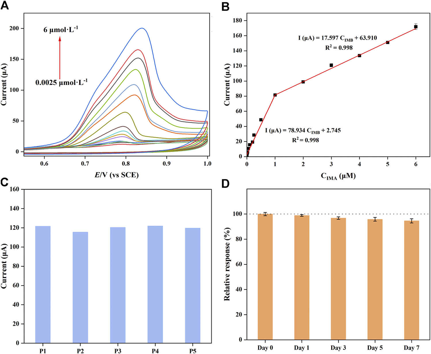 (A) Cyclic voltammograms and (B) calibration curves of CuMOF-AB/GCE at various concentrations (0.0025–6 μM) during IMB determination in PBS solution (pH = 7). (C) CV response of the five parallel electrodes to 3 μM IMB. (D) Stability of the fabricated sensors during a 7-day storage period.